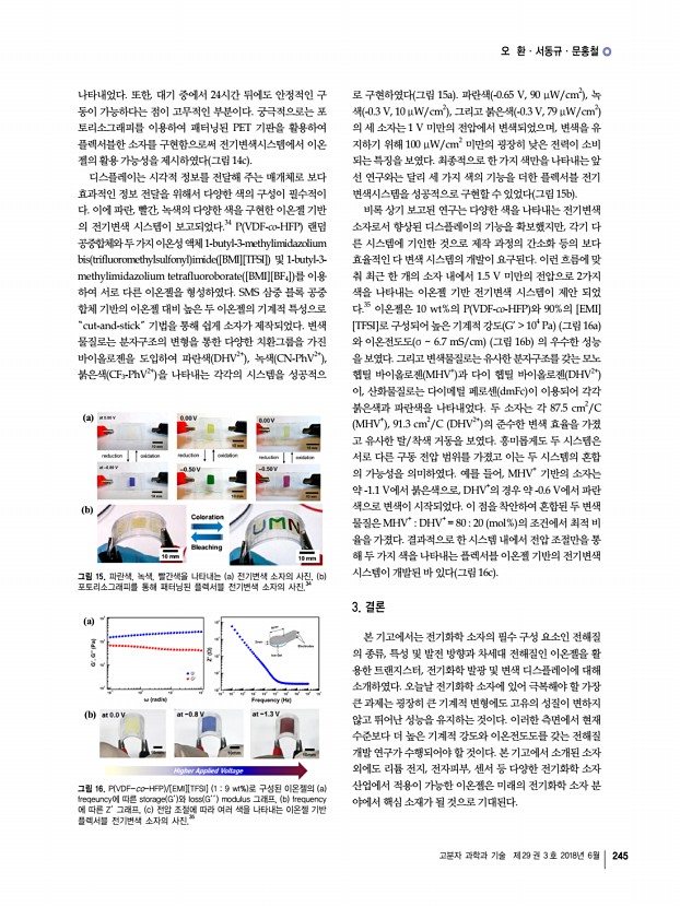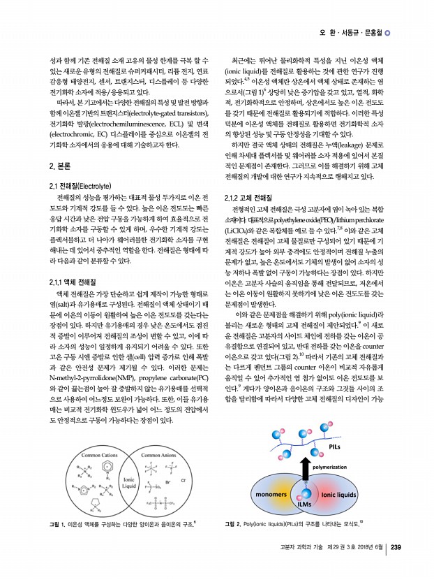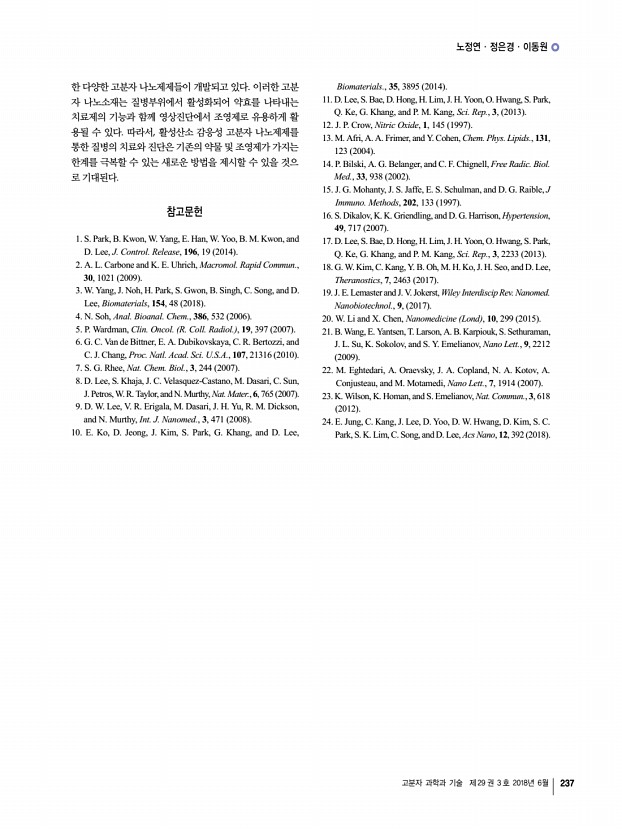 노정연ㆍ정은경ㆍ이동원 고분자 과학과 기술 제 29 권 3 호 2018년 6월 237 한 다양한 고분자 나노제제들이 개발되고 있다. 이러한 고분 자 나노소재는 질병부위에서 활성화되어 약효를 나타내는 치료제의 기능과 함께 영상진단에서 조영제로 유용하게 활 용될 수 있다. 따라서, 활성산소 감응성 고분자 나노제제를 통한 질병의 치료와 진단은 기존의 약물 및 조영제가 가지는 한계를 극복할 수 있는 새로운 방법을 제시할 수 있을 것으 로 기대된다. 참고문헌 1. S. Park, B. Kwon, W. Yang, E. Han, W. Yoo, B. M. Kwon, and D. Lee, J. Control. Release, 196, 19 2014 2. A. L. Carbone and K. E. Uhrich, Macromol. Rapid Commun., 30, 1021 2009 3. W. Yang, J. Noh, H. Park, S. Gwon, B. Singh, C. Song, and D. Lee, Biomaterials, 154, 48 2018 4. N. Soh, Anal. Bioanal. Chem., 386, 532 2006 5. P. Wardman, Clin. Oncol. R. Coll. Radiol. , 19, 397 2007 6. G. C. Van de ...