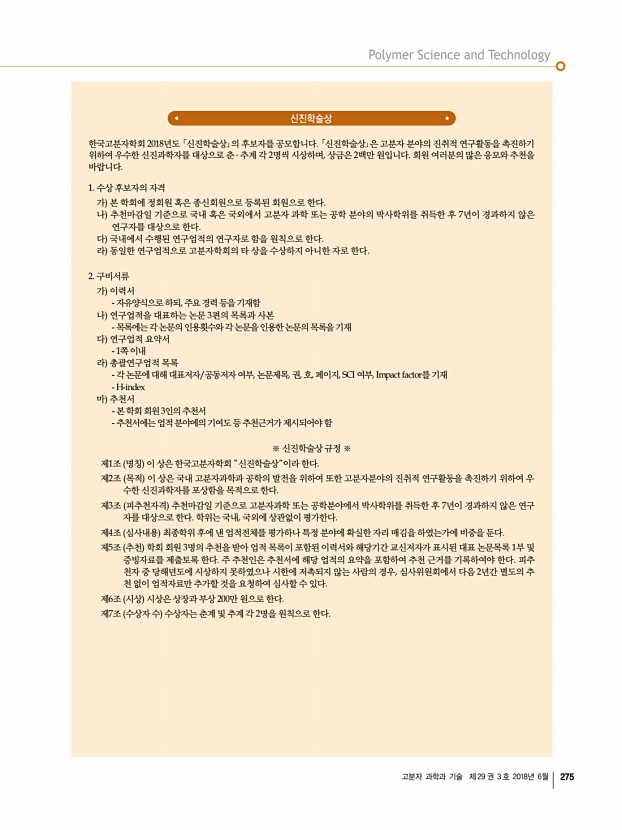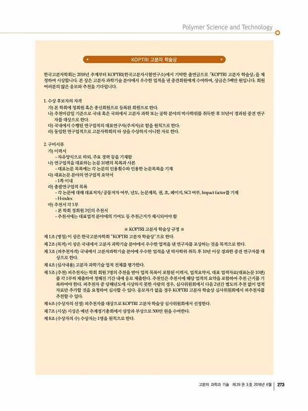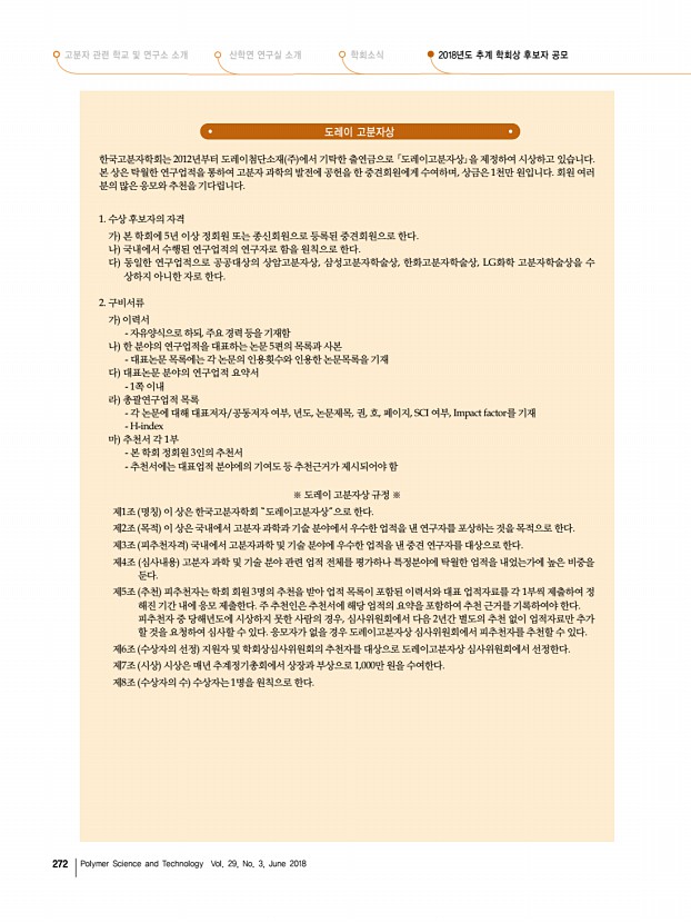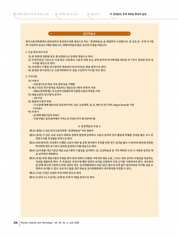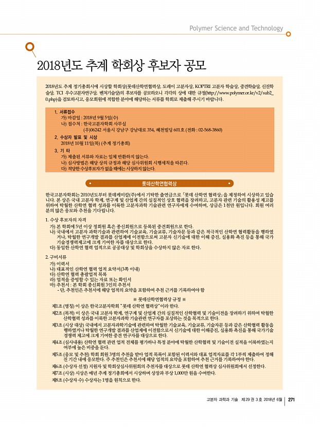 고분자 과학과 기술 제 29 권 3 호 2018년 6월 271 2018년도 추계 학회상 후보자 공모 2018년도 추계 정기총회시에 시상할 학회상 롯데산학연협력상, 도레이 고분자상, KOPTRI 고분자 학술상, 중견학술상, 신진학 술상, TCI 우수고분자연구상, 벤처기술상 의 후보자를 공모하오니 각각의 상에 대한 규정 http//www.polymer.or.kr/v2/sub2_ 0.php 을 검토하시고, 응모회원에 적합한 분야에 해당하는 서류를 학회로 제출해 주시기 바랍니다. 1. 서류접수 가 마감일 2018년 9월 5일 수 나 접수처 한국고분자학회 사무실 우 06242 서울시 강남구 강남대로 354, 혜천빌딩 601호 전화 02-568-3860 2. 수상자 발표 및 시상 2018년 10월 11일 목 추계 정기총회 3. 기 타 가 제출된 서류와 자료는 일체 반환하지 않는다. 나 심사방법은 해당 상의 규정과 해당 심사위원회 시행세칙을 따른다. 다 적당한 수상...