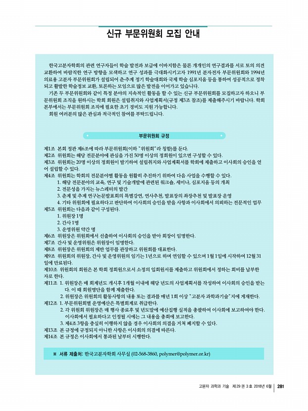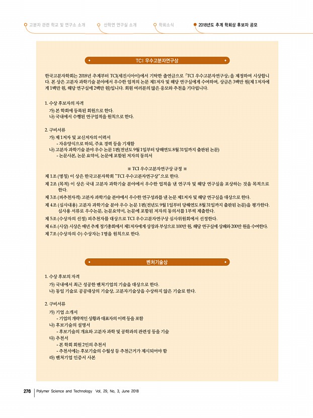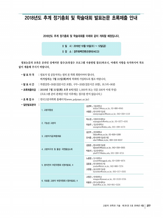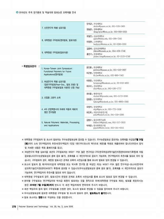 ...-4662 허수미╷전남대학교 shur@jnu.ac.kr, 062-530-1772 3. 산업용 고분자 소재 최치훈╷현대자동차 chchoi1@hyundai.com, 031-5172-3336 강호종╷단국대학교 hjkang@dankook.ac.kr, 031-8005-3582 4. 4차 산업혁명시대 차세대 자동차 재료의 첨단 연구동향 오정석╷경상대학교 ohjs@gnu.ac.kr, 055-772-1658 하진욱╷자동차부품연구원 juha@katech.re.kr, 041-559-3206 5. Natural PolymersMaterials, Processing, and Applications 김병수╷울산과학기술원 bskim19@gmail.com, 052-217-2923 박제영╷한국화학연구원 jypark@krict.re.kr, 052-241-6315 ※ 대학원생 구두발표자 및 포스터 발표자는 우수논문발표상에 응모할 수 있습니다. 우수논문발표상 응모자는 초록제출 마감일 7월 31일 화 까지 소속 연구책임자의 추천서 연구책임자 1인당 1편 구두/포스터 택1 으로 제한 를 학회로 제출하여야 합니다 추천서 양식 및 자세한 내용은 학회 홈...