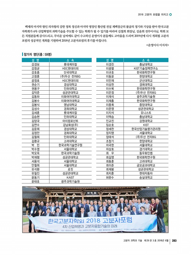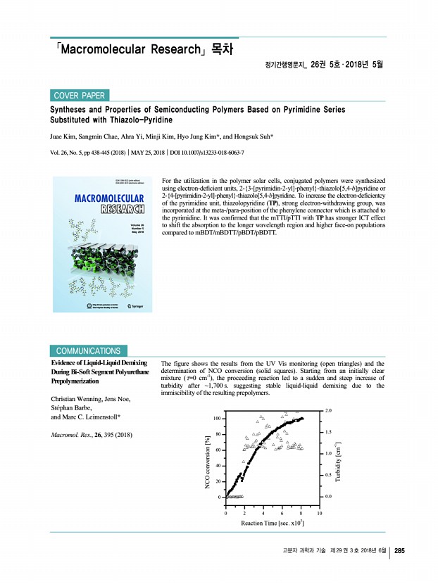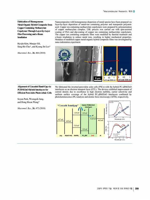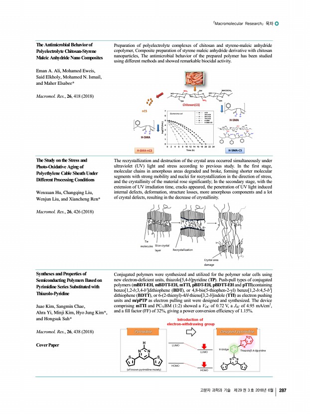 「Macromolecular Research」 목차 고분자 과학과 기술 제 29 권 3 호 2018년 6월 287 The Antimicrobial Behavior of Polyelectrolyte Chitosan-Styrene Maleic Anhydride Nano Composites Eman A. Ali, Mohamed Eweis, Said Elkholy, Mohamed N. Ismail, and Maher Elsabee* Macromol. Res., 26, 418 2018 Preparation of polyelectrolyte complexes of chitosan and styrene-maleic anhydride copolymer, Composite preparation of styrene maleic anhydride derivative with chitosan nanoparticles, The antimicrobial behavior of the prepared polymer has been studied using different methods and showed remarkable biocidal activity. The Study on the Stress and Photo-Oxidative Aging of Polyethylene Cable Sheath Under Different Processing Conditions Wenxuan Hu, Changqing Liu, Wenjun Liu, and Xiancheng Ren* Macromol. Res., 26, 426 2018 The recrystallization and destruction of the crystal area occurred simultaneously under ultraviolet UV light and stress according to previous study. In the first stage, molecula...
