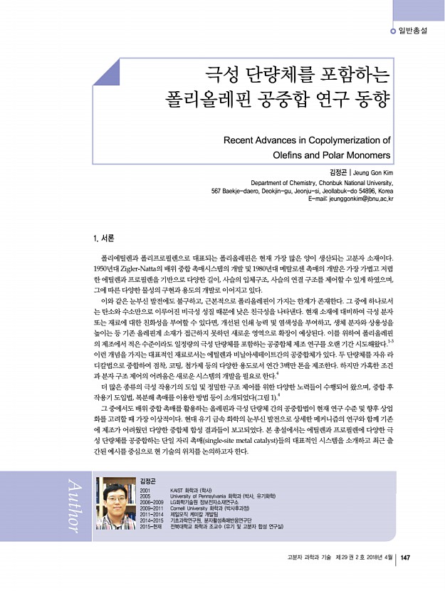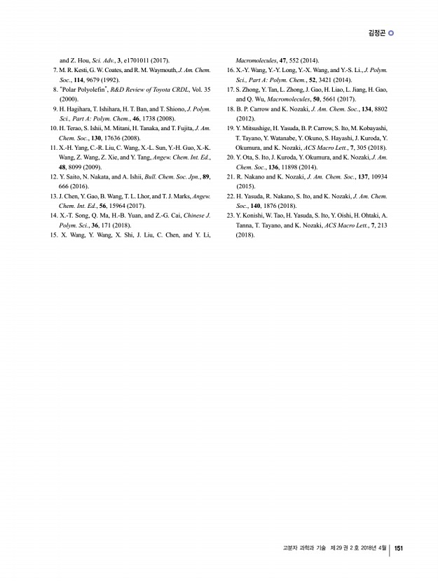 김정곤 고분자 과학과 기술 제 29 권 2 호 2018년 4월 151 and Z. Hou, Sci. Adv., 3, e1701011 2017 7. M. R. Kesti, G. W. Coates, and R. M. Waymouth, J. Am. Chem. Soc., 114, 9679 1992 8. “Polar Polyolefin”, R&D Review of Toyota CRDL, Vol. 35 2000 9. H. Hagihara, T. Ishihara, H. T. Ban, and T. Shiono, J. Polym. Sci., Part APolym. Chem., 46, 1738 2008 10. H. Terao, S. Ishii, M. Mitani, H. Tanaka, and T. Fujita, J. Am. Chem. Soc., 130, 17636 2008 11. X.-H. Yang, C.-R. Liu, C. Wang, X.-L. Sun, Y.-H. Guo, X.-K. Wang, Z. Wang, Z. Xie, and Y. Tang, Angew. Chem. Int. Ed., 48, 8099 2009 12. Y. Saito, N. Nakata, and A. Ishii, Bull. Chem. Soc. Jpn., 89, 666 2016 13. J. Chen, Y. Gao, B. Wang, T. L. Lhor, and T. J. Marks, Angew. Chem. Int. Ed., 56, 15964 2017 14. X.-T. Song, Q. Ma, H.-B. Yuan, and Z.-G. Cai, Chinese J. Polym. Sci., 36, 171 2018 15. X. Wang, Y. Wang, X. Shi, J. Liu, C. Chen, and Y. Li, Macromolecules, 47, 552 2014 16. X.-Y. Wang, Y.-Y. Long, Y.-X. Wang, and Y.-S. Li.,...