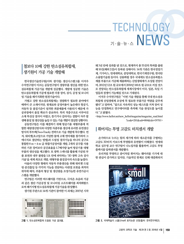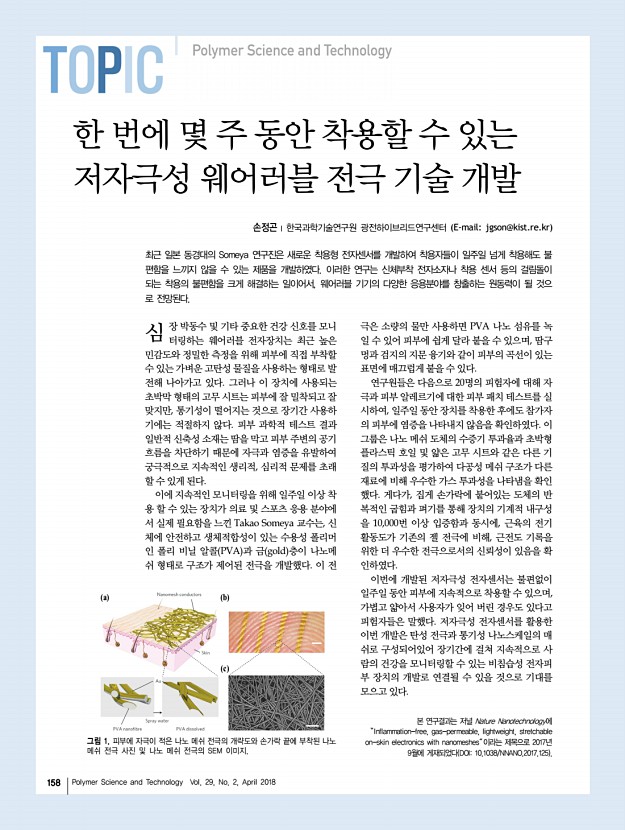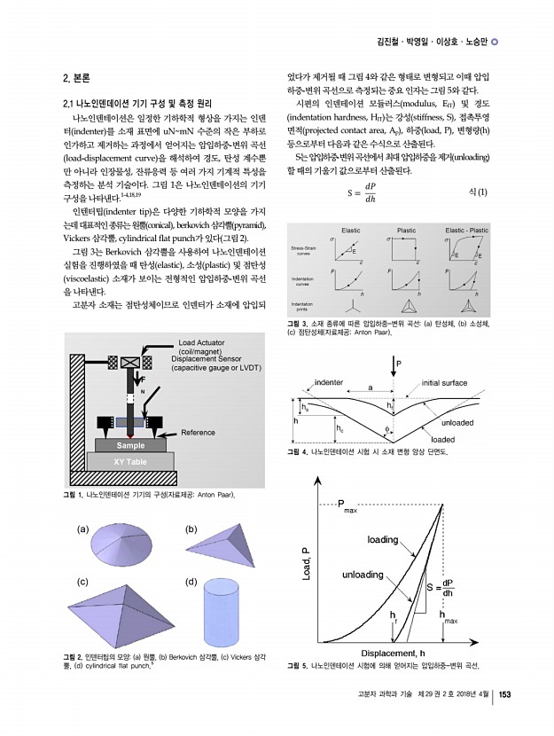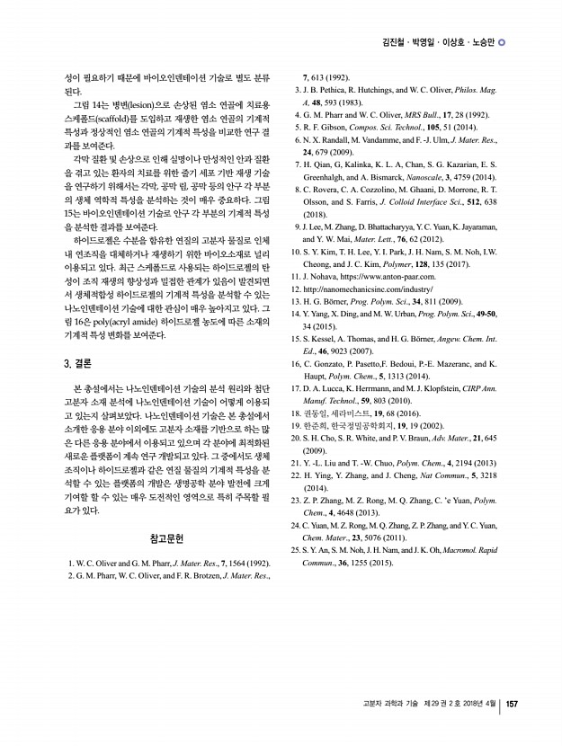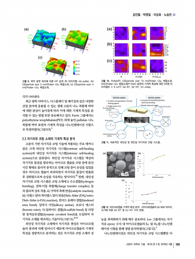 김진철ㆍ박영일ㆍ이상호ㆍ노승만 고분자 과학과 기술 제 29 권 2 호 2018년 4월 155 그림 9. 박막 표면 위치에 따른 HIT 값의 3D 이미지맵a pullan, b CS particle size5 nm /Pullan 나노 복합소재, c CS particle size4 nm /Pullan 나노 복합소재. 그림 10. Pullan P , CS particle size15 nm /Pullan 나노 복합소재, CNC/Pullan 나노 복합소재 P-CNC 표면의 기계적 특성에 대한 2차원 이 미지맵 6 × 6 μm2 a EIT, b HIT, c creep. 그림 11. 대표적인 내인성 및 외인성 자기치유 코팅 시스템. 그림 12. 마이크로캡슐 기계적 특성 분석마이크로캡슐의 a SEM 이미지, 크기에 따른 b EIT 및 c HIT 수치 변화. 각각 나타낸다. 최근 광학 디바이스, 디스플레이 및 패키징과 같은 다양한 산업 분야에 응용될 수 있는 생체 고분자 나노 복합체 박막 에 대한 관심이 높아짐에 따라 이에 대한 기계적 특성을 분 석할 수 있는 방법 또한 ...