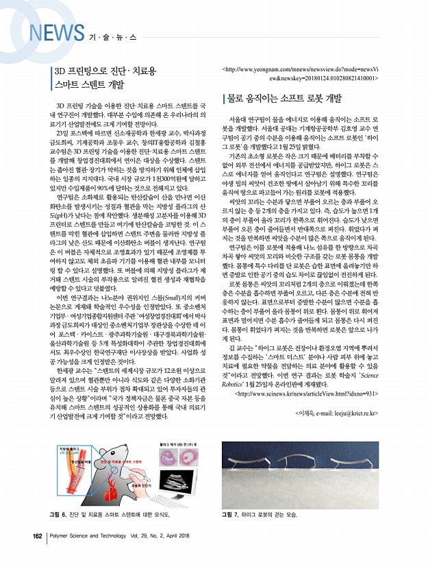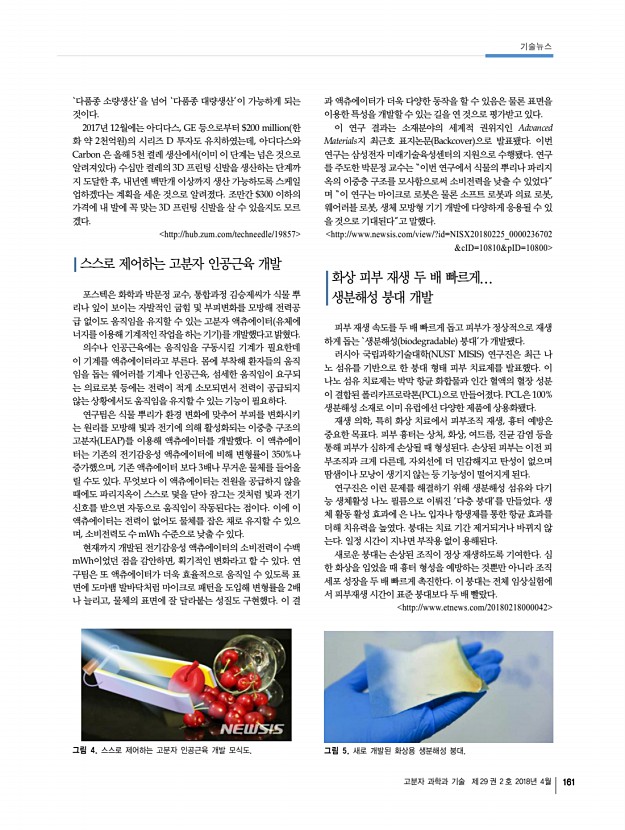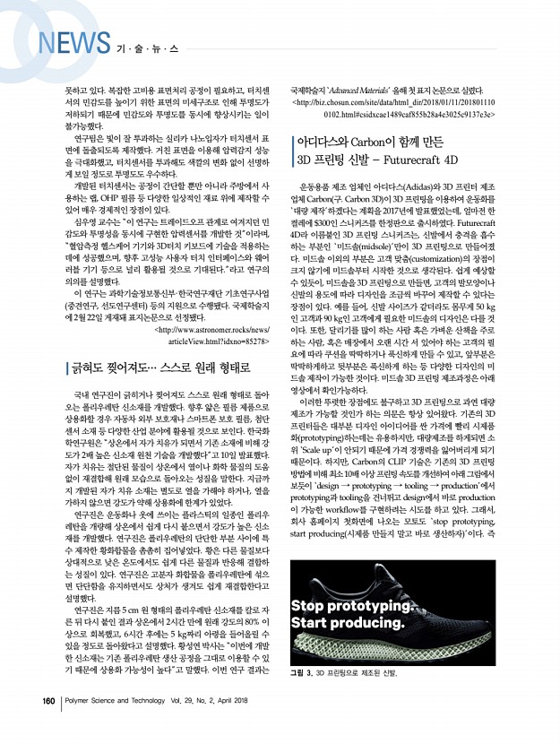 고분자 과학과 기술 제 29 권 2 호 2018년 4월 161 그림 4. 스스로 제어하는 고분자 인공근육 개발 모식도. 그림 5. 새로 개발된 화상용 생분해성 붕대. ‘다품종 소량생산’을 넘어 ‘다품종 대량생산’이 가능하게 되는 것이다. 2017년 12월에는 아디다스, GE 등으로부터 $200 million 한 화 약 2천억원 의 시리즈 D 투자도 유치하였는데, 아디다스와 Carbon 은 올해 5천 켤레 생산에서 이미 이 단계는 넘은 것으로 알려져있다 수십만 켤레의 3D 프린팅 신발을 생산하는 단계까 지 도달한 후, 내년엔 백만개 이상까지 생산 가능하도록 스케일 업하겠다는 계획을 세운 것으로 알려졌다. 조만간 $300 이하의 가격에 내 발에 꼭 맞는 3D 프린팅 신발을 살 수 있을지도 모르 겠다. http//hub.zum.com/techneedle/19857 스스로 제어하는 고분자 인공근육개발 포스텍은 화학과 박문정 교수, 통...
