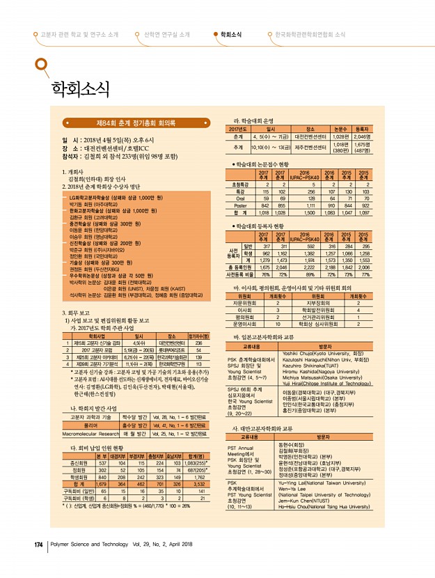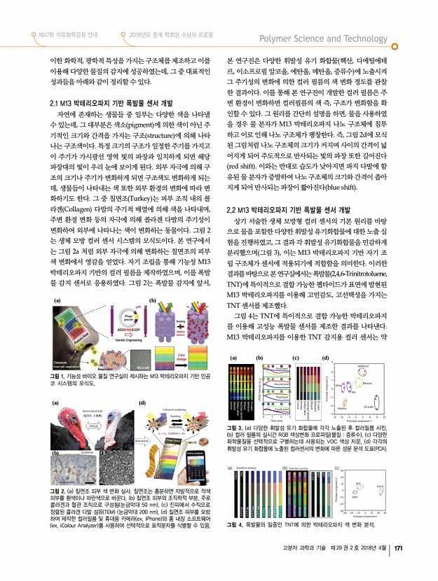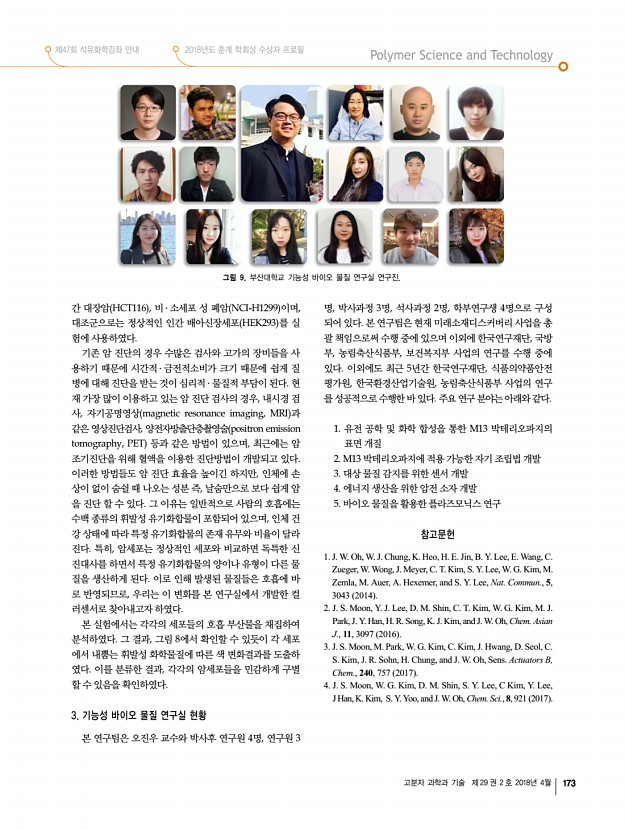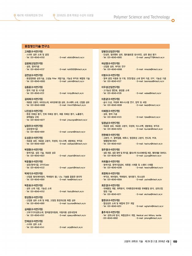 제47회 석유화학강좌 안내 2018년도 춘계 학회상 수상자 프로필 고분자 과학과 기술 제 29 권 2 호 2018년 4월 169 융합생산기술 연구소 고재훈 수석연구원 ·스마트 섬유 소재 및 공정 ·Tel031-8040-6102 ·E-mailellafiz@kitech.re.kr 김쌍희 선임연구원 ·섬유, 염색가공 ·Tel031-8040-6137 ·E-mailksh0502@kitech.re.kr 김연상 수석연구원 ·환경정화용 섬유기술, 고성능 Filter 개발기술, 기능성 부직포 복합화 기술 ·Tel031-8040-6083 ·E-mailyskim@kitech.re.kr 김종윤 수석연구원 ·염색 가공 및 시가공 ·Tel031-8040-6131 ·E-mailkimjy@kitech.re.kr 김태희 수석연구원 ·의료용 고분자, 바이오소재, 바이오메디컬 섬유, 코스메틱 소재, 산업용 섬유 ·Tel031-8040-6088 ·E-mailthkim75@kitech.re.kr 나진성 수석연구원 ·환경 위해성 평가, 인체 위해성 평가, 제품 위해성 평가, 노출평가, 화학물질 규제 ·Tel031-8040-6077 ·E-mailji...