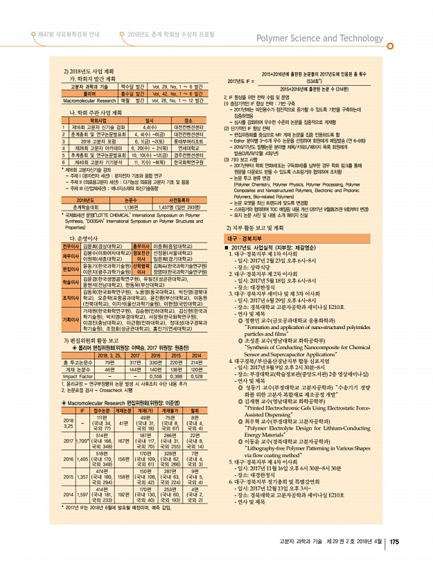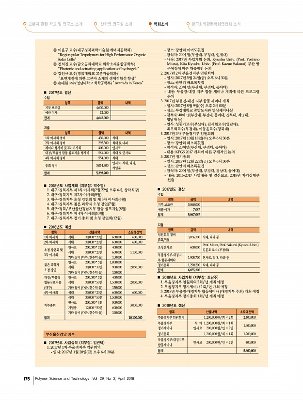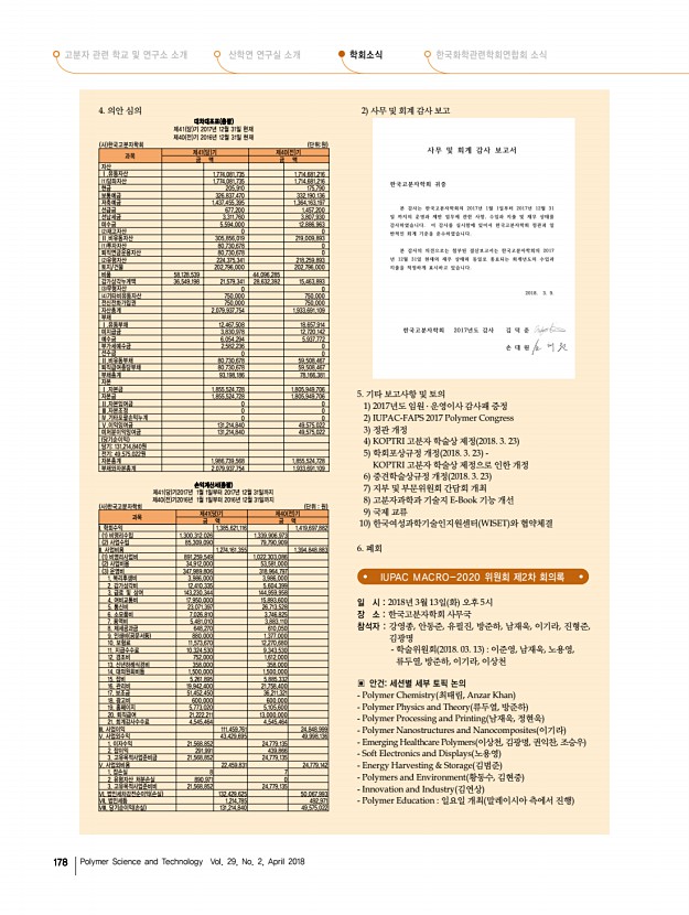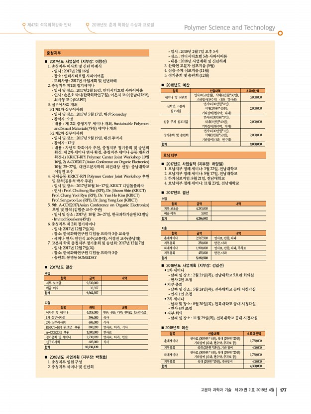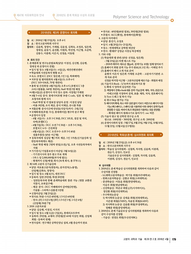 제47회 석유화학강좌 안내 2018년도 춘계 학회상 수상자 프로필 고분자 과학과 기술 제 29 권 2 호 2018년 4월 179 2018년도 제3차 운영이사 회의록 일 시 2018년 3월 15일 목 오후 4시 장 소 한국고분자학회 사무국 참석자 김윤희, 정영미, 가재원, 김윤경, 김희숙, 조정호, 임은희, 정대성, 윤동기, 윤진환, 이원목, 박진영, 이근형, 오준학, 김봉수, 이종휘, 이은지, 선정윤, 이동원 ▣ 회의 안건 1. 춘계총회 및 연구논문발표회 담당이경진, 김신현, 김승현, 정대성 외 운영이사 전원 • 일시 및 장소4월 4일 수 6일 금 , 대전컨벤션센터 • 학술대회 사전등록자 현황 보고 • 숙소호텔 ICC DCC 맞은편, 1인 1실, 학회예약 • 지부장 및 평의원회의4월 4일 수 오후 6시 DCC 103+104호, 70명 개런티 • 총회 및 간친회장4월 5일 목 오후 6시 호텔 ICC 1층 크리스탈볼룸, 140명 개런티 , Staff ...