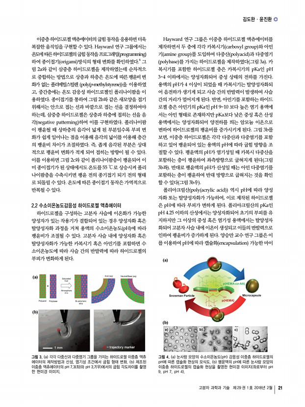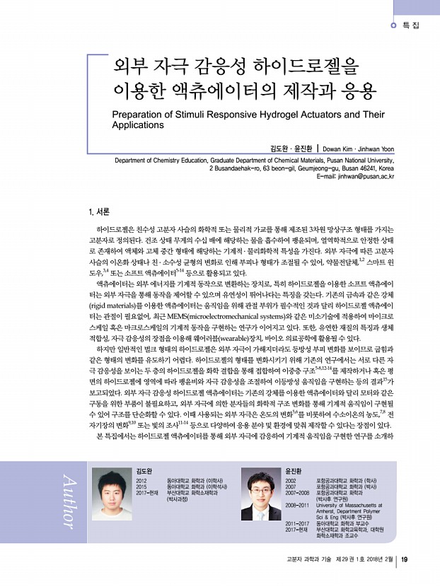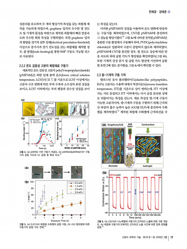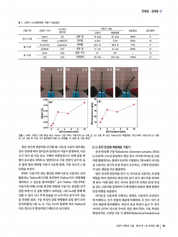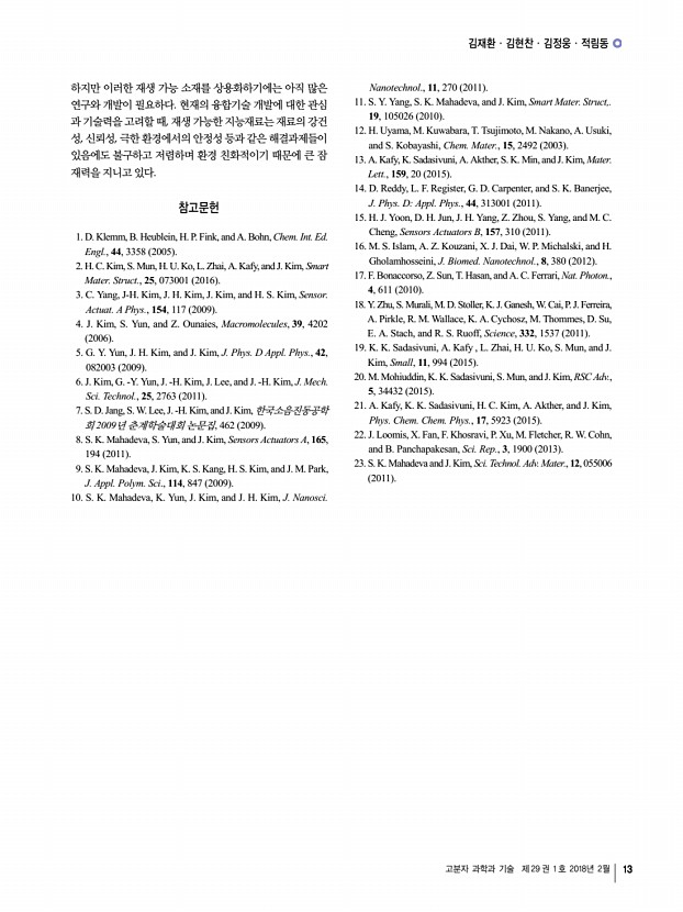김재환ㆍ김현찬ㆍ김정웅ㆍ적림동 고분자 과학과 기술 제 29 권 1 호 2018년 2월 13 하지만 이러한 재생 가능 소재를 상용화하기에는 아직 많은 연구와 개발이 필요하다. 현재의 융합기술 개발에 대한 관심 과 기술력을 고려할 때, 재생 가능한 지능재료는 재료의 강건 성, 신뢰성, 극한 환경에서의 안정성 등과 같은 해결과제들이 있음에도 불구하고 저렴하며 환경 친화적이기 때문에 큰 잠 재력을 지니고 있다. 참고문헌 1. D. Klemm, B. Heublein, H. P. Fink, and A. Bohn, Chem. Int. Ed. Engl., 44, 3358 2005 2. H. C. Kim, S. Mun, H. U. Ko, L. Zhai, A. Kafy, and J. Kim, Smart Mater. Struct., 25, 073001 2016 3. C. Yang, J-H. Kim, J. H. Kim, J. Kim, and H. S. Kim, Sensor. Actuat. A Phys., 154, 117 2009 4. J. Kim, S. Yun, and Z. Ounaies, Macromolecules, 39, 4202 2006 5. G. Y. Yun, J. H. Kim, and J. Kim, J. Phys. D Appl. Phys., 42, 082003 2009 6. J. Kim, G. -Y. Yun, J...