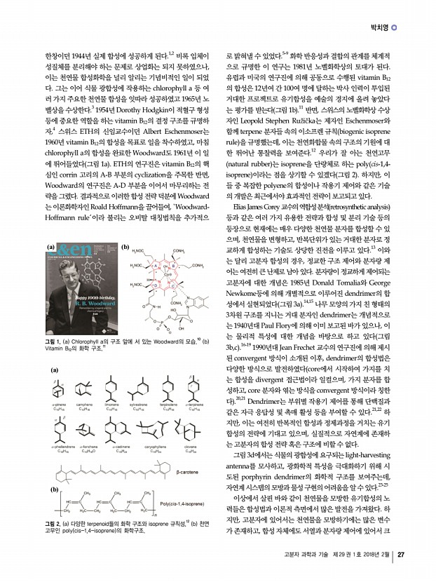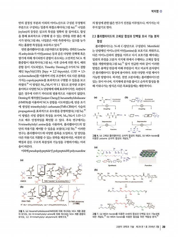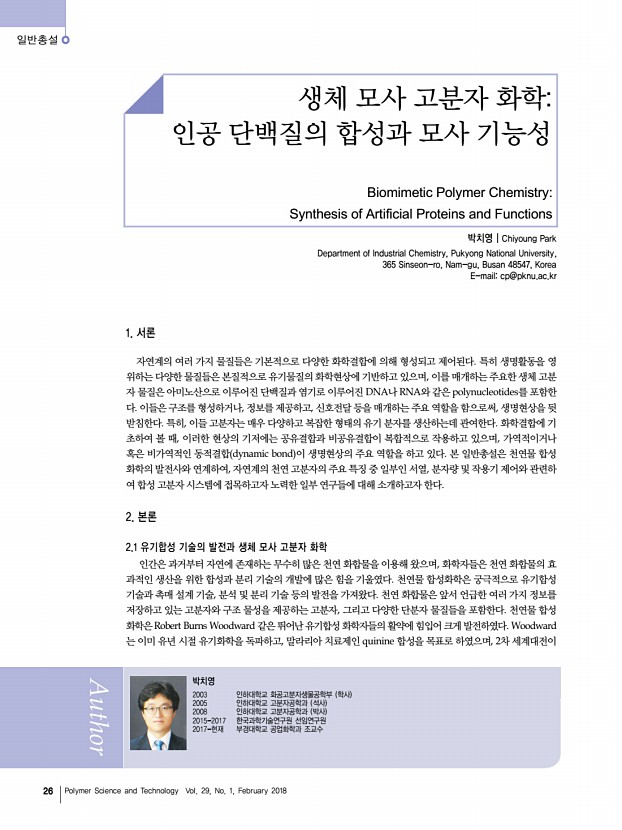 일반총설 26 Polymer Science and Technology Vol. 29, No. 1, February 2018 박치영 2003 인하대학교 화공고분자생물공학부 학사 2005 인하대학교 고분자공학과 석사 2008 인하대학교 고분자공학과 박사 2015-2017 한국과학기술연구원 선임연구원 2017-현재 부경대학교 공업화학과 조교수 생체 모사 고분자 화학인공 단백질의 합성과 모사 기능성 Biomimetic Polymer ChemistrySynthesis of Artificial Proteins and Functions 박치영 | Chiyoung Park Department of Industrial Chemistry, Pukyong National University, 365 Sinseon-ro, Nam-gu, Busan 48547, Korea E-mailcp@pknu.ac.kr 1. 서론 자연계의 여러 가지 물질들은 기본적으로 다양한 화학결합에 의해 형성되고 제어된다. 특히 생명활동을 영 위하는 다양한 물질들은 본질적으로 유기물질의 화학현상에 기반하고 있으며, 이를 매개하는 주요한 생체 고분 자 물질은 아미노산으로 이루어...