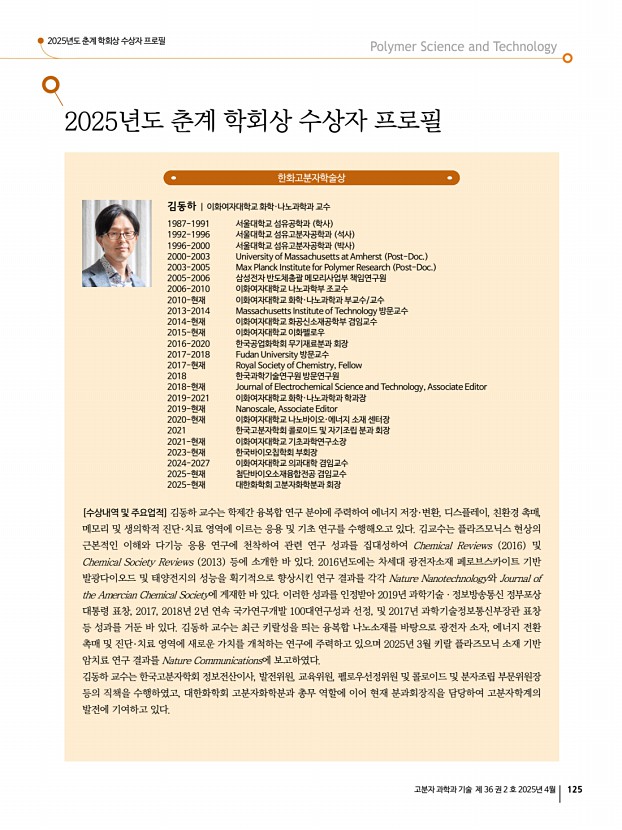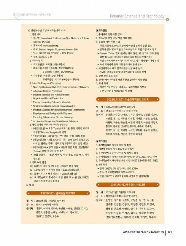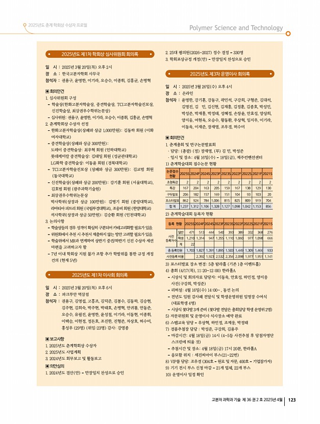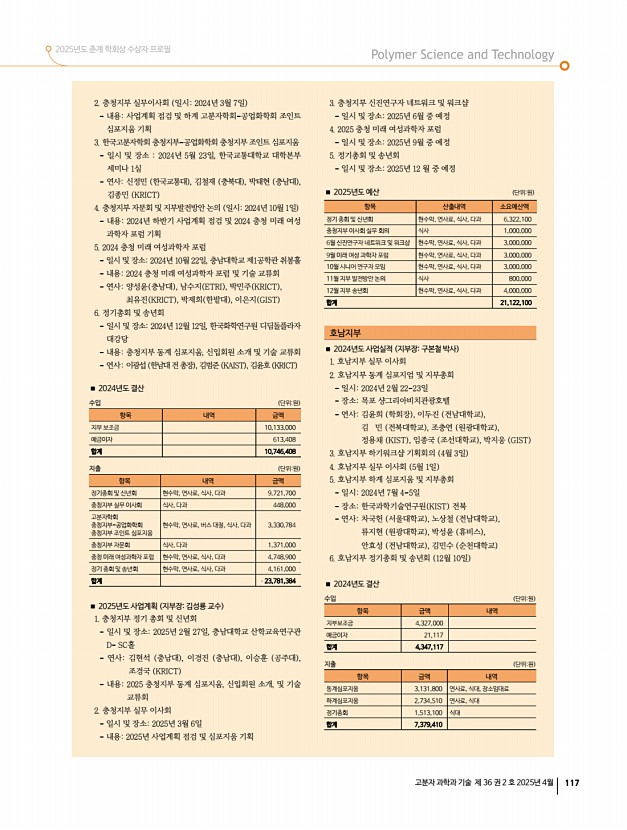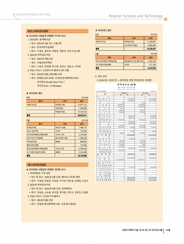 2025년도 춘계 학회상 수상자 프로필 고분자 과학과 기술 제 36 권 2 호 2025년 4월 119 에너지부문위원회 2024년도 사업실적 위원장김덕준 교수 1. 초대위원장 기념 강연 일시 및 장소2024년 2월 15일, 베트남 나트랑 대학 연사이상영, 유필진, 김진웅, 이기라, 박문정, 김태일, 오승수 2. 2024년 하계심포지엄 일시 및 장소2024년 8월 13일, 연세대학교 연사김남동, 소순용, 유지영, 장지현, 김석구, 김호정, 김영준 3. PSK-이녹스 신진연구자 웨비나 일시2024년 8월 13일 연사김영준 한국화학연구원 , 김호정 서울대 2024년도 결산 수입 단위원 항목 내역 금액 부문위 보조금 하계심포지움 11,220,007 신규부문위 지원금 3,000,000 합계 14,220,007 지출 단위원 항목 내역 금액 한국고분자학회 추계학술대회 창립총회 및 세션 운영 경비 4,205,400 신구 부문위 합동 회의 식사비 211,100 합계 4...
