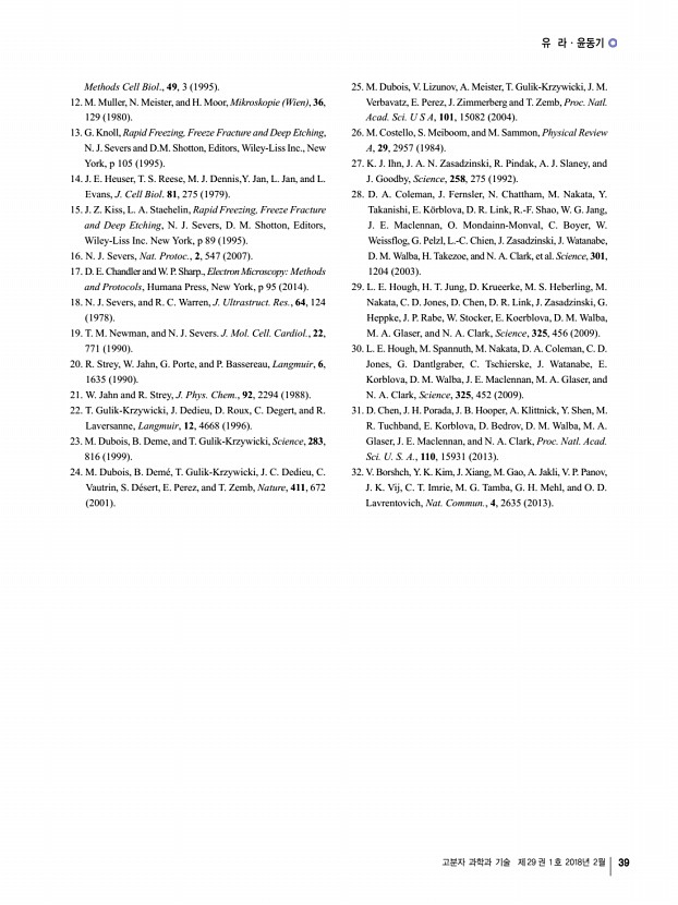 유 라ㆍ윤동기 고분자 과학과 기술 제 29 권 1 호 2018년 2월 39 Methods Cell Biol., 49, 3 1995 12. M. Muller, N. Meister, and H. Moor, Mikroskopie Wien , 36, 129 1980 13. G. Knoll, Rapid Freezing, Freeze Fracture and Deep Etching, N. J. Severs and D.M. Shotton, Editors, Wiley-Liss Inc., New York, p 105 1995 14. J. E. Heuser, T. S. Reese, M. J. Dennis,Y. Jan, L. Jan, and L. Evans, J. Cell Biol. 81, 275 1979 15. J. Z. Kiss, L. A. Staehelin, Rapid Freezing, Freeze Fracture and Deep Etching, N. J. Severs, D. M. Shotton, Editors, Wiley-Liss Inc. New York, p 89 1995 16. N. J. Severs, Nat. Protoc., 2, 547 2007 17. D. E. Chandler and W. P. Sharp., Electron MicroscopyMethods and Protocols, Humana Press, New York, p 95 2014 18. N. J. Severs, and R. C. Warren, J. Ultrastruct. Res., 64, 124 1978 19. T. M. Newman, and N. J. Severs. J. Mol. Cell. Cardiol., 22, 771 1990 20. R. Strey, W. Jahn, G. Porte, and P. Bassereau, Langmuir, 6, 1635 1990 21. W. Jahn and R. Strey, J. Phys. Chem., ...