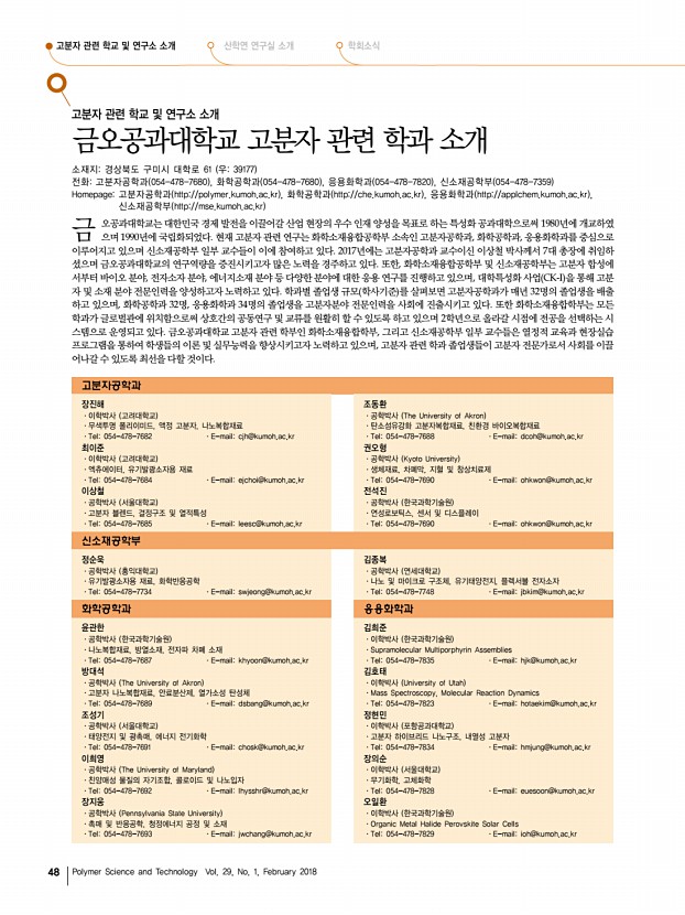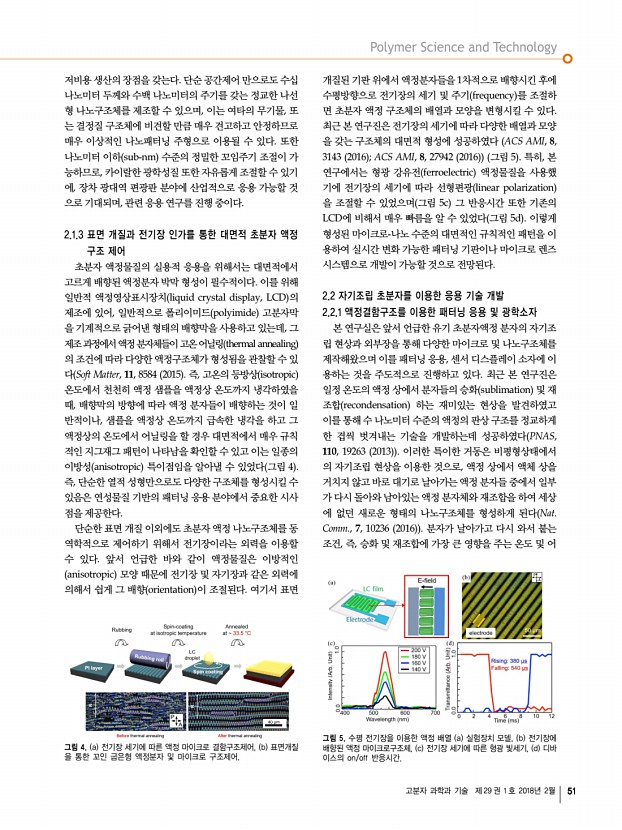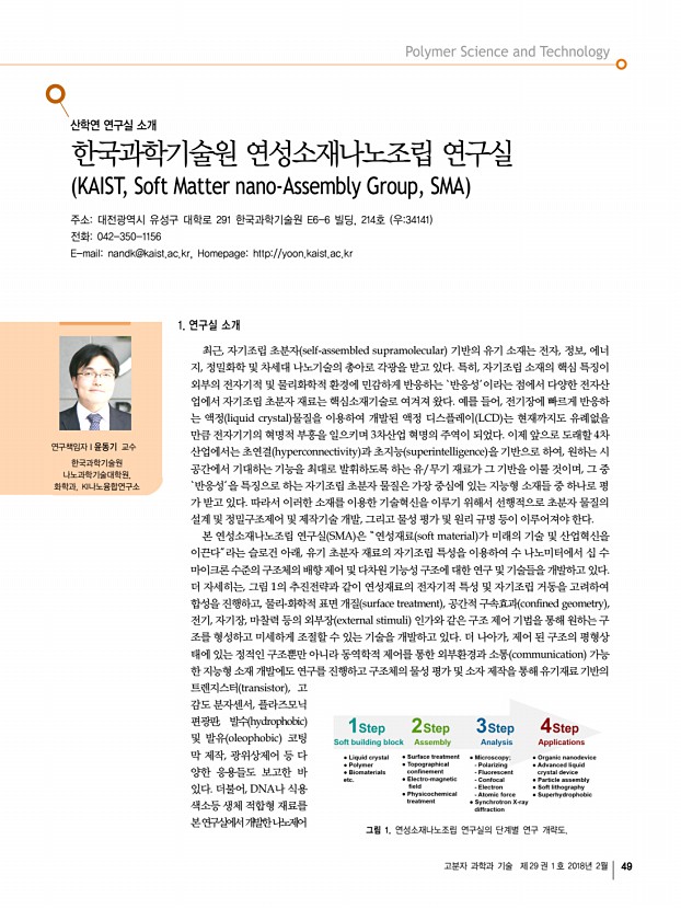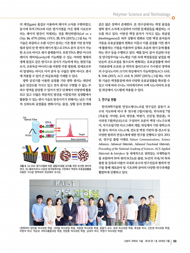 고분자 과학과 기술 제 29 권 1 호 2018년 2월 53 왼쪽부터 양민용 박사과정 학생, 서아람 박사과정 학생, 차윤정 박사과정 학생, 윤동기 교수, 유라 박사과정 학생, 류성호 박사, 신민정 박사과정 학생, 이원석 박사, 박순모 석박사통합과정 학생, 한문종 박사과정 학생, 김대석 박사, 박원기 박사과정 학생 그림 8. a DNA 염기서열에 따른 결합/비결합 감지를 위한 비선형 레이져 센서. b 플라즈모닉 다공성 양극알루미늄 기판에서 액정의 유효굴절률을 이용한 가시광 영역대의 위상제어 모식도. 의 게인 gain 물질로 이용하여 레이저 소자를 구현하였고, 동시에 목적 DNA와 다른 염기서열을 가진 생체 시료로부 터는 레이저 발진이 억제되는 것을 확인하였다 Lab on a Chip, 16, 4770 2016 ; OPEX, 25, 874 2017 그림 8a 이 기술은 복잡하고 오랜 시간이 걸리는 기존 형광 기반 분석...