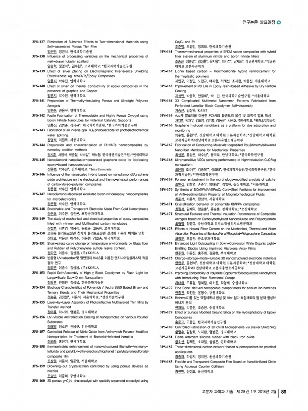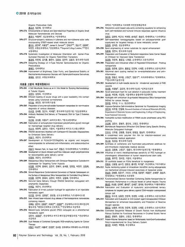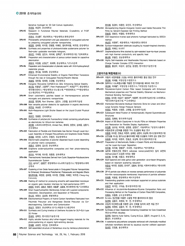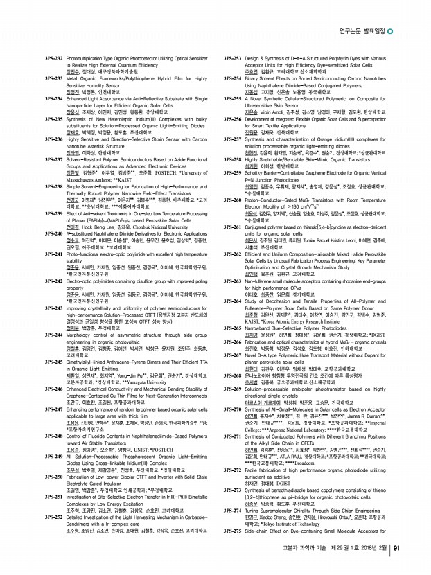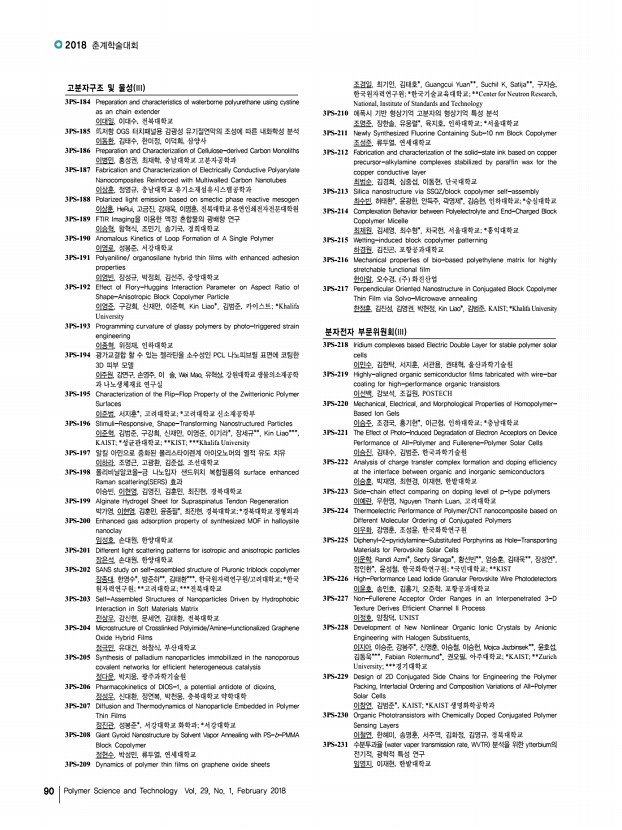 ...재원, 조경렬, 전남대학교 3PS-98 Inorganic Perovskite CsPbBr3-xIx QDsEnhancing Optical Stability 최신일, 이광섭*, 고윤혁**, Prem Prabhakaran***, 박재근****, 한남대학교 대덕밸리캠퍼스; *한남대학교 나노광소재; **한양대학교; ***한남대학교 신소재공학과; ****한남대학교 3PS-99 Smart colorimetric patches based on thermoresponsive polymer microgels and plasmonic nanoparticles 최아영, 염정희, Ravi Shanker, 김민수, 고현협, 울산과학기술원 3PS-100 New versatile polymer dielectric for application in organic electronics 최연길, 표승문, 건국대학교 3PS-101 Multi-Responsive Light Shutter Based on the Liquid Crystal Physical Gels 최유진, 정광운, 전북대학교 3PS-102 Synthesize of poly acrylic fluorosulfonyl imide containing polyethylene as electrolytes for lithium-ion batteries 최인환, 스트라다사부찬드라, Ahmed Faiz, 류태욱, 양한모, 김재웅, 김환기, 건국대학교 3PS-103 Fabric...