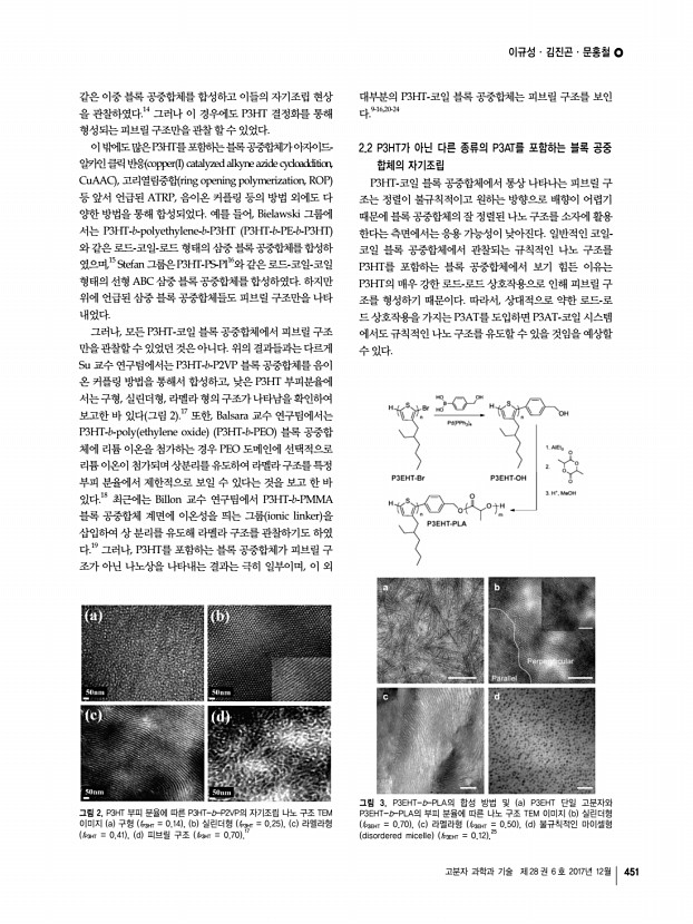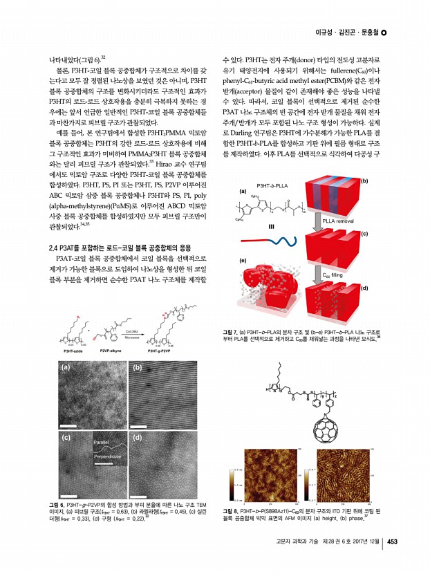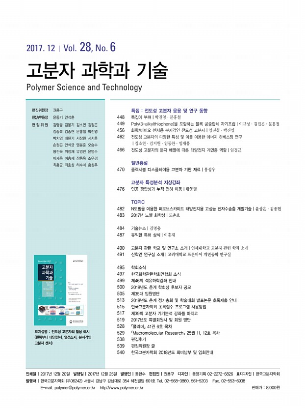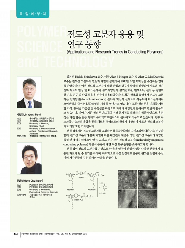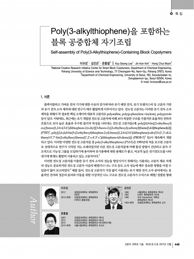 특 집 고분자 과학과 기술 제 28 권 6 호 2017년 12월 449 Poly 3-alkylthiophene 을 포함하는 블록 공중합체 자기조립 Self-assembly of Poly 3-Alkylthiophene -Containing Block Copolymers 이규성1ㆍ김진곤1ㆍ문홍철2 | Kyu Seong Lee1ㆍJin Kon Kim1ㆍHong Chul Moon2 1 National Creative Research Initiative Center for Smart Block Copolymers, Department of Chemical Engineering, Pohang University of Science and Technology, 77 Cheongam-Ro, Nam-Gu, Pohang 37673, Korea 2 Department of Chemical Engineering, University of Seoul, 163, Seoulsiripdae-ro, Dongdaemun-gu, Seoul 02504, Korea E-mailhcmoon@uos.ac.kr 이규성 2012 포항공과대학교 화학공학과 학사 2012-현재 포항공과대학교 화학공학과 석박사 통합과정 김진곤 1980 서울대학교 화학공학과 학사 1982 KAIST 화학공학과 석사 1990 미국 Polytechnic 대학교 화학공학과 박사 1993-현재 포항공과대학교 화학공학과 교수 문홍철 2007 포항공과...