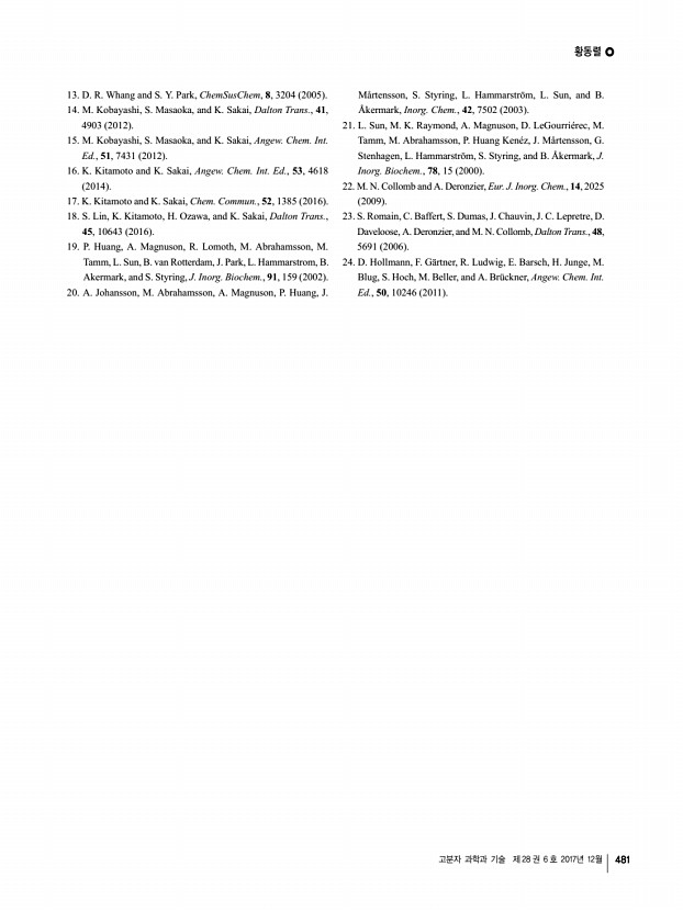 황동렬 고분자 과학과 기술 제 28 권 6 호 2017년 12월 481 13. D. R. Whang and S. Y. Park, ChemSusChem, 8, 3204 2005 14. M. Kobayashi, S. Masaoka, and K. Sakai, Dalton Trans., 41, 4903 2012 15. M. Kobayashi, S. Masaoka, and K. Sakai, Angew. Chem. Int. Ed., 51, 7431 2012 16. K. Kitamoto and K. Sakai, Angew. Chem. Int. Ed., 53, 4618 2014 17. K. Kitamoto and K. Sakai, Chem. Commun., 52, 1385 2016 18. S. Lin, K. Kitamoto, H. Ozawa, and K. Sakai, Dalton Trans., 45, 10643 2016 19. P. Huang, A. Magnuson, R. Lomoth, M. Abrahamsson, M. Tamm, L. Sun, B. van Rotterdam, J. Park, L. Hammarstrom, B. Akermark, and S. Styring, J. Inorg. Biochem., 91, 159 2002 20. A. Johansson, M. Abrahamsson, A. Magnuson, P. Huang, J. Mårtensson, S. Styring, L. Hammarström, L. Sun, and B. Åkermark, Inorg. Chem., 42, 7502 2003 21. L. Sun, M. K. Raymond, A. Magnuson, D. LeGourriérec, M. Tamm, M. Abrahamsson, P. Huang Kenéz, J. Mårtensson, G. Stenhagen, L. Hammarström, S. Styring, and B. Åkermark, J....