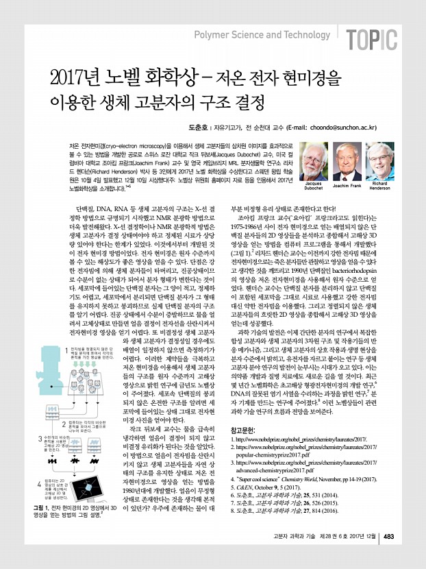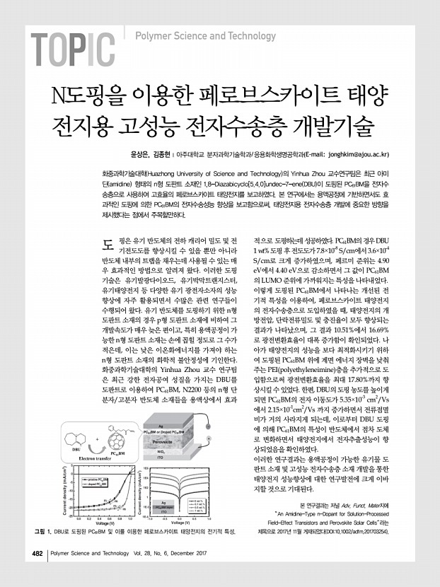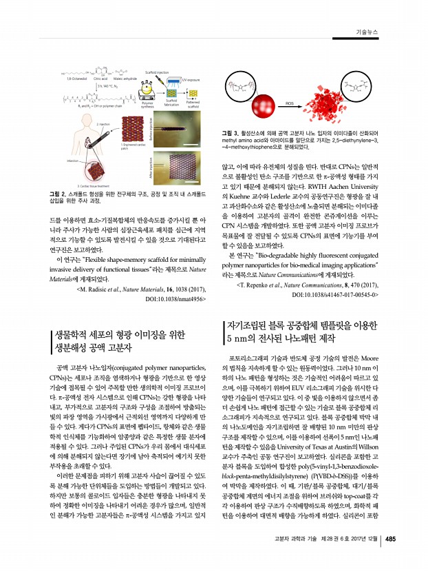 고분자 과학과 기술 제 28 권 6 호 2017년 12월 485 그림 3. 활성산소에 의해 공액 고분자 나노 입자의 이미다졸이 산화되어 methyl amino acid와 아마이드를 말단으로 가지는 2,5-diethynylene-3, -4-methoxythiophene으로 분해되었다. 그림 2. 스캐폴드 형성을 위한 전구체의 구조, 공정 및 조직 내 스캐폴드 삽입을 위한 주사 과정. 드를 이용하면 효소-기질복합체의 반응속도를 증가시킬 뿐 아 니라 주사가 가능한 사람의 심장근육세포 패치를 심근에 지역 적으로 기능할 수 있도록 발전시킬 수 있을 것으로 기대된다고 연구진은 보고하였다. 이 연구는 “Flexible shape-memory scaffold for minimally invasive delivery of functional tissues”라는 제목으로 Nature Materials에 게재되었다. M. Radisic et al., Nature Materials, 16, 1038 2017 , DOI10.1038/nmat4956 생물학적 세포의 형광 이미징을위한 생분해성 공액고분자...