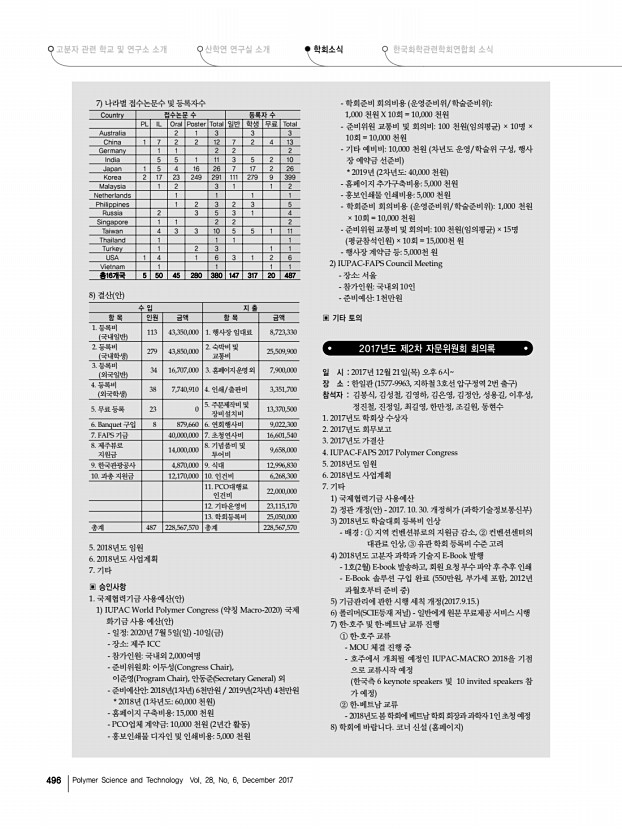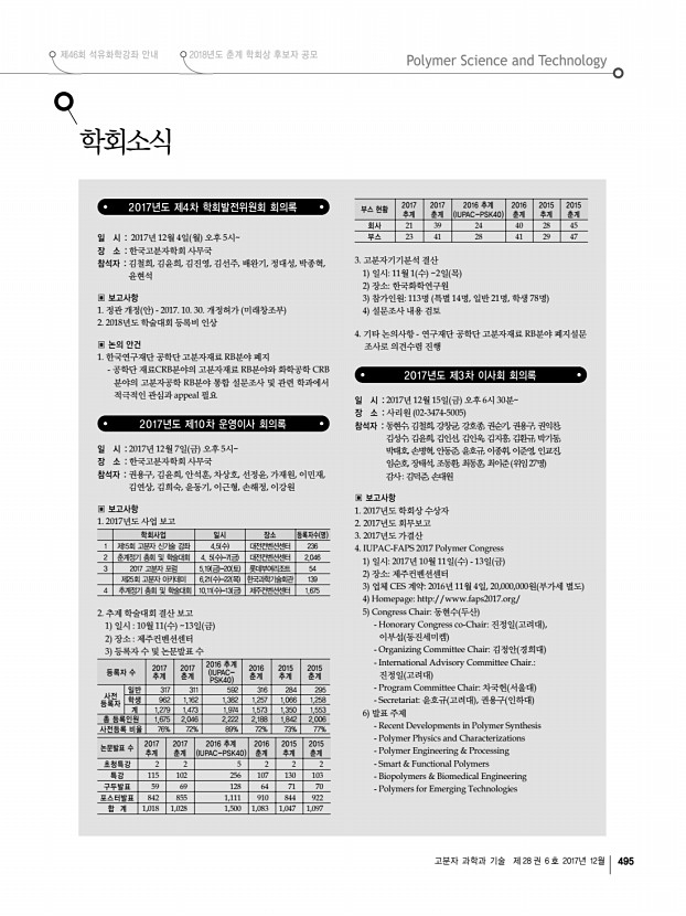 ..., 김윤희, 안석훈, 차상호, 선정윤, 가재원, 이민재, 김연상, 김희숙, 윤동기, 이근형, 손해정, 이강원 ▣ 보고사항 1. 2017년도 사업 보고 학회사업 일시 장소 등록자수 명 1 제15회 고분자 신기술 강좌 4.5 수 대전컨벤션센터 236 2 춘계정기 총회 및 학술대회 4. 5 수 -7 금 대전컨벤션센터 2,046 3 2017 고분자 포럼 5.19 금 -20 토 롯데부여리조트 54 제25회 고분자 아카데미 6.21 수 -22 목 한국과학기술회관 139 4 추계정기 총회 및 학술대회 10.11 수 -13 금 제주컨벤션센터 1,675 2. 추계 학술대회 결산 보고 1 일시 10월 11 수 13일 금 2 장소 제주컨벤션센터 3 등록자 수 및 논문발표 수 등록자 수 2017 추계 2017 춘계 2016 추계 IUPACPSK40 2016 춘계 2015 추계 2015 춘계 사전 등록자 일반 317 311 592 316 284 295 학생 962 1,162 1,382 1,257 1,066 1,258 계 1,279 1,473 1,974 1,573 1,350 1,553 총 등록인원 1,675 2,046 2...