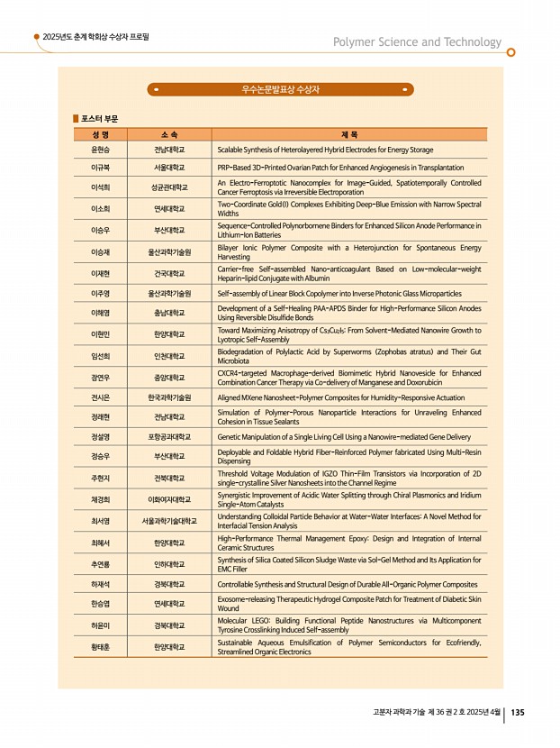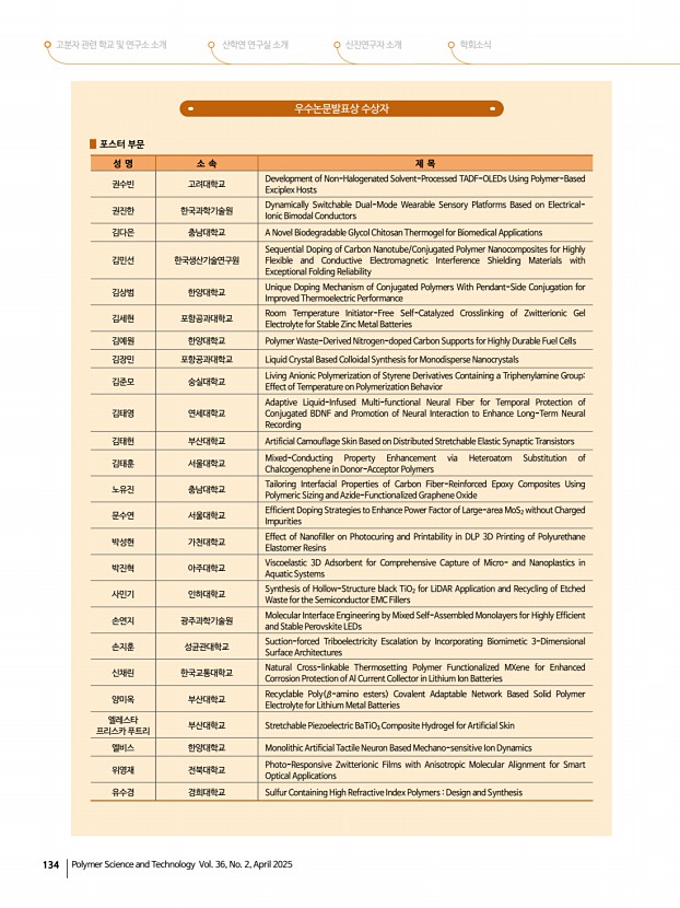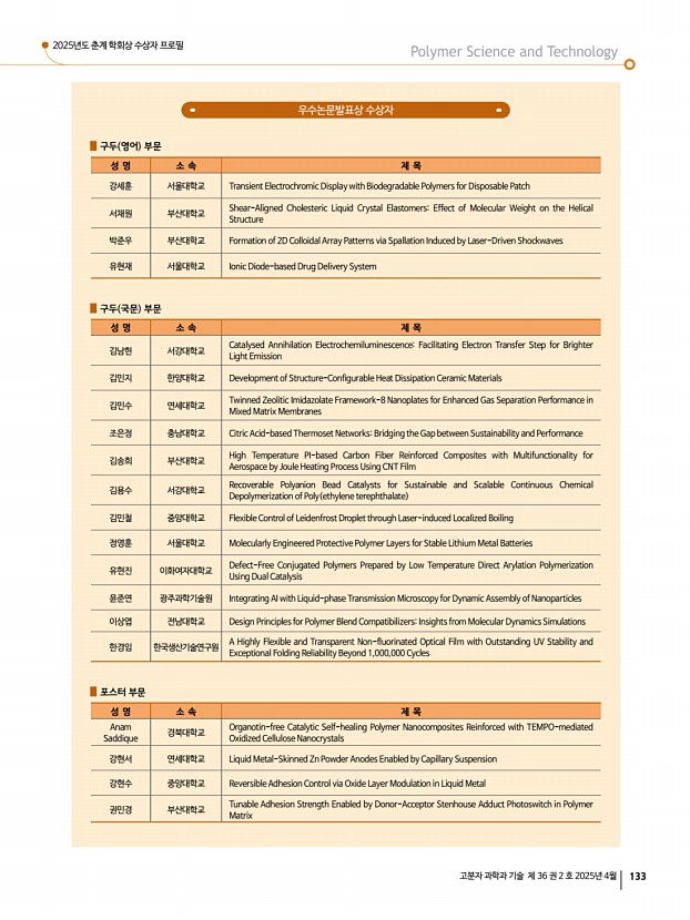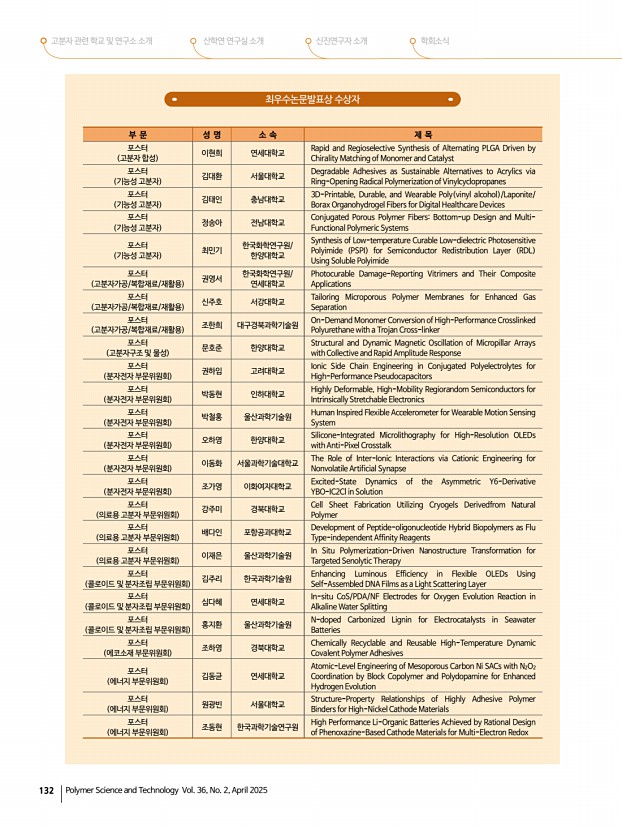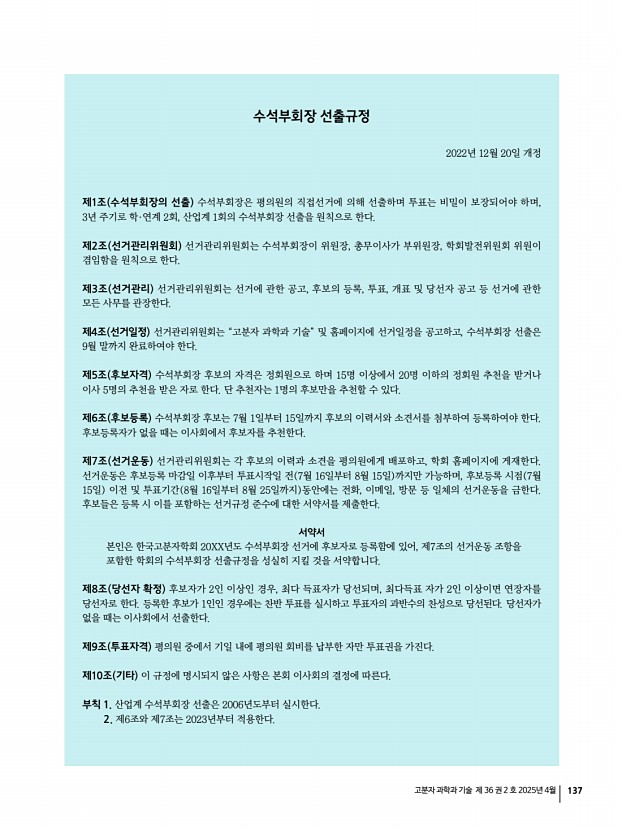 고분자 과학과 기술 제 36 권 2 호 2025년 4월 137 수석부회장 선출규정 2022년 12월 20일 개정 제 1조 수석부회장의 선출 수석부회장은 평의원의 직접선거에 의해 선출하며 투표는 비밀이 보장되어야 하며, 3년 주기로 학·연계 2회, 산업계 1회의 수석부회장 선출을 원칙으로 한다. 제 2조 선거관리위원회 선거관리위원회는 수석부회장이 위원장, 총무이사가 부위원장, 학회발전위원회 위원이 겸임함을 원칙으로 한다. 제 3조 선거관리 선거관리위원회는 선거에 관한 공고, 후보의 등록, 투표, 개표 및 당선자 공고 등 선거에 관한 모든 사무를 관장한다. 제 4조 선거일정 선거관리위원회는 “고분자 과학과 기술” 및 홈페이지에 선거일정을 공고하고, 수석부회장 선출은 9월 말까지 완료하여야 한다. 제 5조 후보자격 수석부회장 후보의 자격은 정회원으로 하며 15...