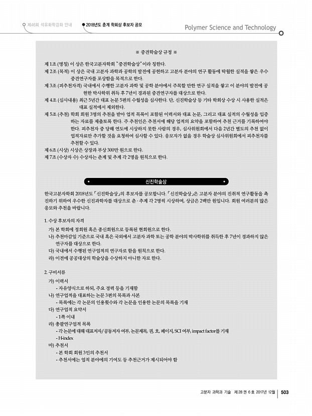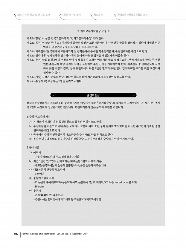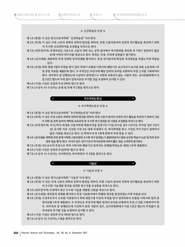 고분자 관련 학교 및 연구소 소개 산학연 연구실 소개 학회소식 한국화학관련학회연합회 소식 504 Polymer Science and Technology Vol. 28, No. 6, December 2017 ※ 신진학술상 규정 ※ 제 1조 명칭 이 상은 한국고분자학회 “신진학술상”이라 한다. 제 2조 목적 이 상은 국내 고분자 과학과 공학의 발전을 위하여, 또한 고분자분야의 진취적 연구활동을 촉진하기 위하 여 우수한 신진과학자를 포상함을 목적으로 한다. 제 3조 피추천자격 추천마감일 기준으로 고분자 과학 또는 공학 분야에서 박사학위를 취득한 후 7년이 경과하지 않은 45세 이하의 연구자를 대상으로 한다. 학위는 국내, 국외에 상관없이 평가한다. 제 4조 심사내용 최종학위 후에 성취한 업적전체를 평가하나, 특정 연구분야에 확실한 자리매김을 하였는가에 비중을 둔다. 제 5조 추천 학회 회원 3명의 추...