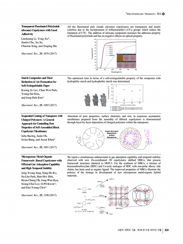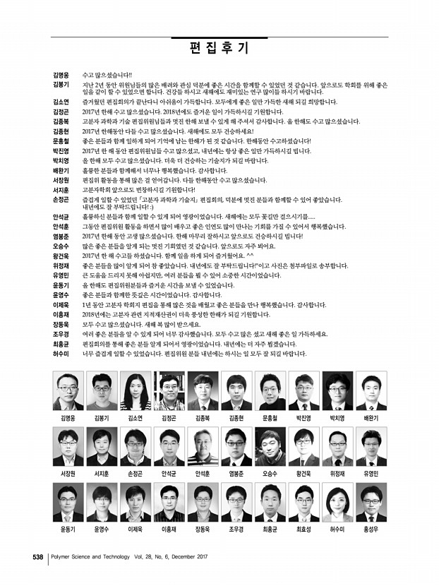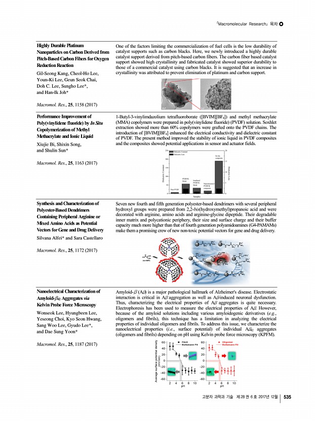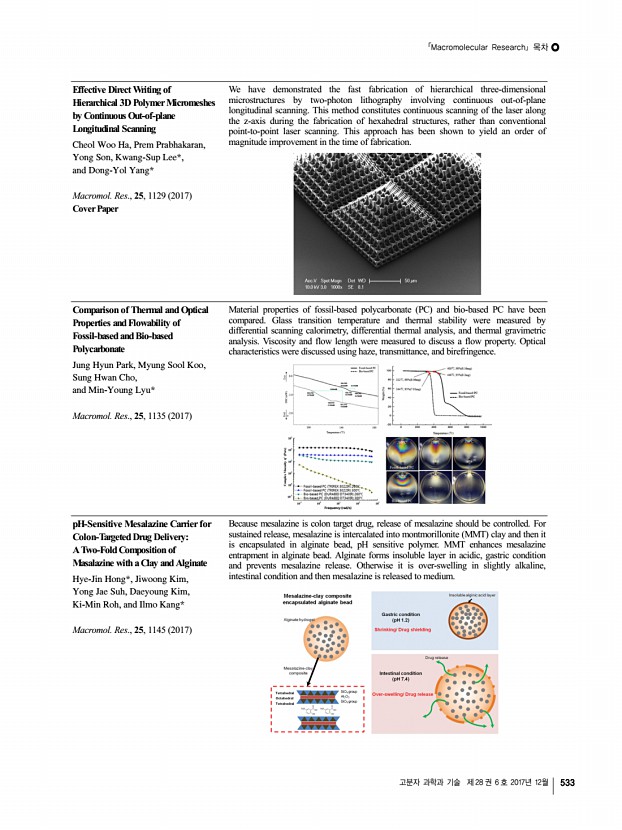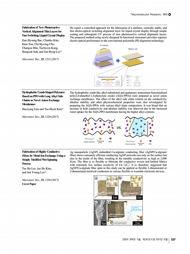 「Macromolecular Research」 목차 고분자 과학과 기술 제 28 권 6 호 2017년 12월 537 Fabrication of New Photoreactive Vertical Alignment Thin Layers for Fast Switching Liquid Crystal Display Eun Hyoung Bae, Chunho Kim, Intae Son, Chi Hyeong Cho, Changsu Min, Taehyeon Kang, Hongsuk Suh, and Jun Hyup Lee* Macromol. Res., 25, 1212 2017 We report a controlled approach for the fabrication of a uniform, vertically stable, and fast electro-optical switching alignment layer for liquid crystal display through simple coating and subsequent UV process of new photoreactive vertical alignment layers. The proposed method using newly designed bi-functional monomers provides superior electro-optical performance to the conventional polyimide PI alignment technology. Hydrophobic Comb-Shaped Polymers Based on PPO with Long Alkyl Side Chains as Novel Anion Exchange Membranes Haeryang Lim and Tae-Hyun Kim* Macromol. Res., 25, 1220 2017 The hydrophobic comb-like alkyl-substituted and quaternar...