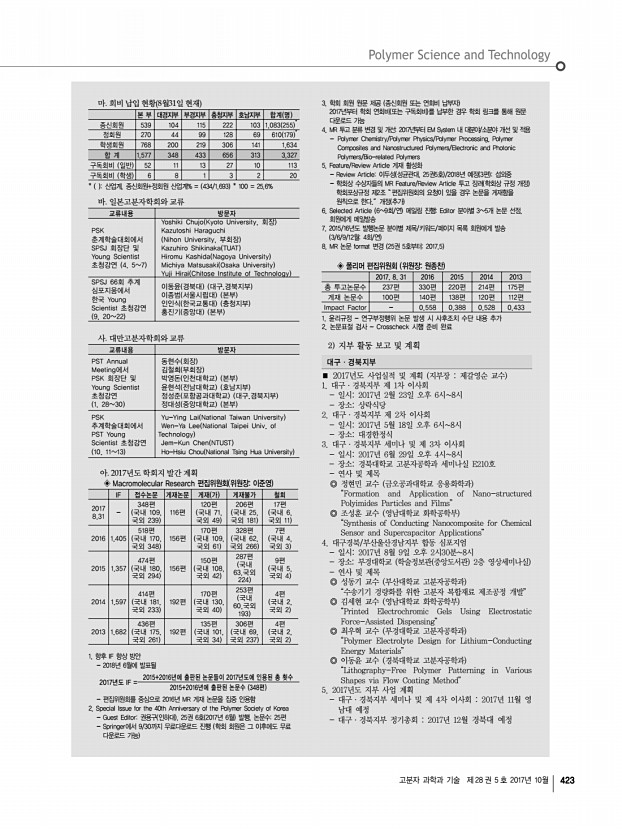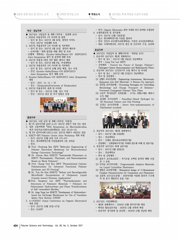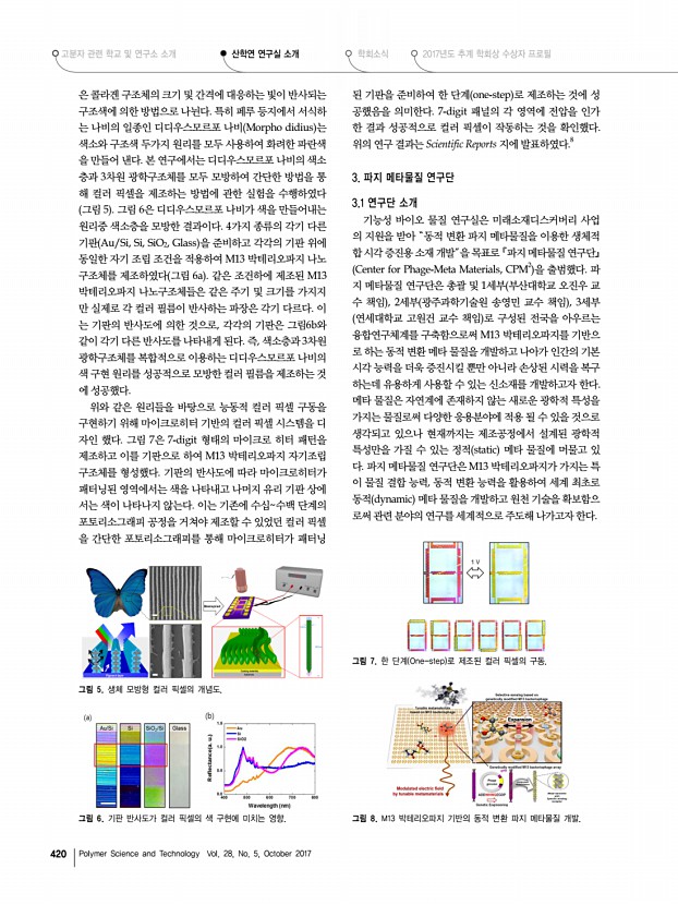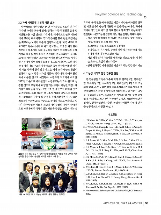 고분자 과학과 기술 제 28 권 5 호 2017년 10월 421 그림 9. 파지 메타물질 연구단은 파지 메타물질의 개발을 통해 인간의 시각 능력을 증진시키고 손상된 시력을 복구하고자 한다. 그림 10. 부산대학교 기능성 바이오 물질 연구실 연구진. 3.2 파지 메타물질 개발의 파급 효과 일반적으로 메타물질은 본 연구단의 주요 목표인 인간 시 각 증진 소자를 포함해 전자/광학소자 등 광범위한 응용 및 시장규모를 가질 것으로 기대되며, 세계적으로 연구 기초단 계에 있지만 목표지향적 국가적 투자를 통해 원천 핵심기술 을 확보하는 노력이 꾸준히 진행되어 왔다. 미국 MURI 프 로그램과 같은 에너지, 바이오, 정보통신, 국방 등 여러 분야 전문가들이 소자의 실제 응용까지 고려한 메타물질의 설계, 개발과 제작을 통합적으로 추진하는 프로그램들이 운영되 고 있다. 메...