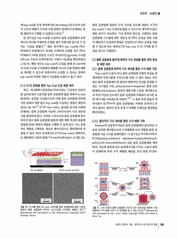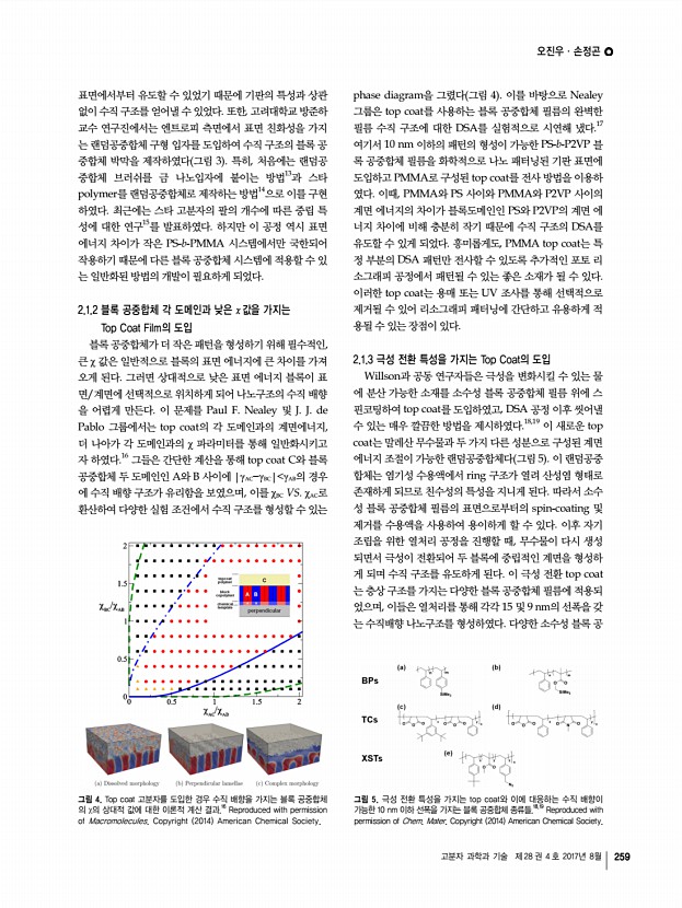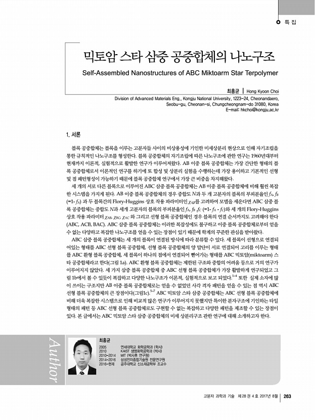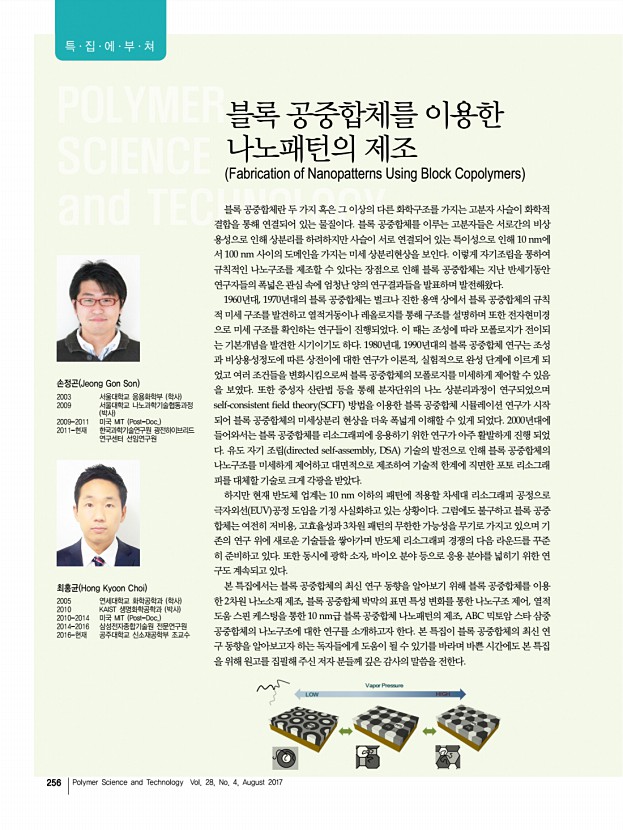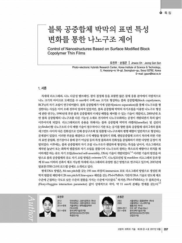특 집 고분자 과학과 기술 제 28 권 4 호 2017년 8월 257 블록 공중합체 박막의 표면 특성 변화를 통한 나노구조 제어 Control of Nanostructures Based on Surface Modified Block Copolymer Thin Films 오진우ㆍ손정곤 | Jinwoo OhㆍJeong Gon Son Photo-electronic Hybrids Research Center, Korea Institute of Science & Technology, 5, Hwarang-ro 14-gil, Seongbuk-gu, Seoul 02792, Korea E-mailjgson@kist.re.kr 오진우 2012 인하대학교 고분자공학과 학사 2014 인하대학교 고분자공학과 석사 2014-현재 서울대학교 화학생물공학부 박사과정 2011-현재 한국과학기술연구원 광전하이브리드연구센터 학생연구원 손정곤 2003 서울대학교 응용화학부 학사 2009 서울대학교 나노과학기술 협동과정 박사 2009-2011 미국 MIT Post-Doc. 2011-현재 한국과학기술연구원 광전하이브리드연구센터 선임연구원 1. 서론 차세대 리소그래피, 나노 다공성 멤브레인, ...