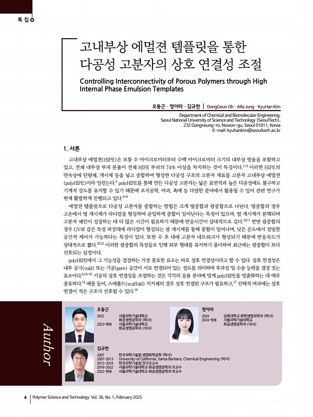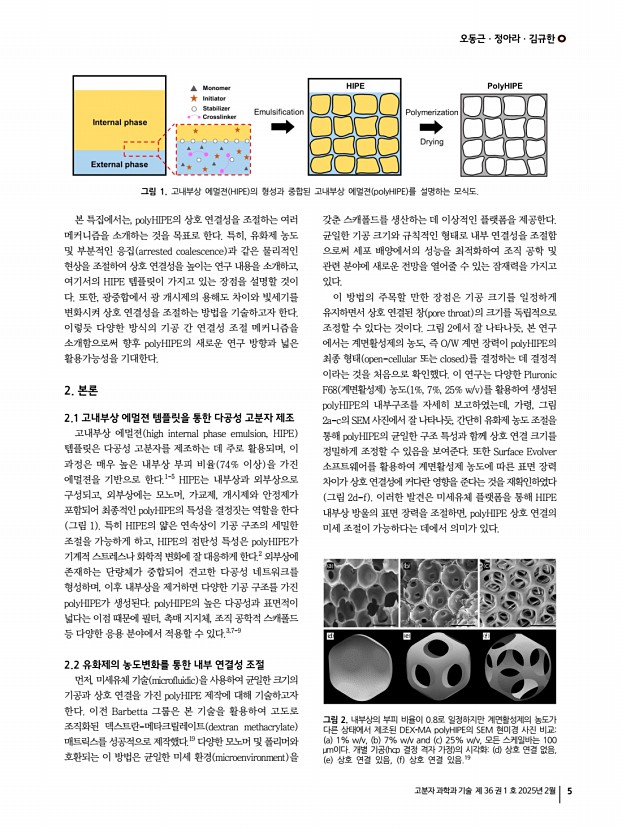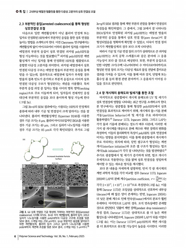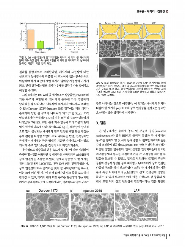 ...에 따라, 닫힌 셀구조가 형성되는 계면 개시 interface initiation 와 오픈 셀 구조가 형성되는 벌크 개시 bulk initiation 가 각각 잘 나타난다는 것을 발견하였다.21 추가로 광중합에서 빛 세기가 증가하게 되면, 벌크 개시가 우세적으로 작용한다는 것을 밝혀 상호 연결성을 정밀하게 제어할 수 있는 새로운 방식을 제시했다. 보다 본 내용을 자세하게 설명하면, 먼저 각 광 개시제의 계면 과학적 특성을 각각 비교할 경우 Darocur 1173, Irgacure 2959와 LAP의 분배 계수 partition coefficient, 는 각각 2×10-1, 1×10-2, 1×10-3으로 측정된다 그림 4a 이를 통해 Darocur 1173은 오일상을 상대적으로 선호하여 내부상 decane 에 꽤 많은 양이 존재하는 반면, Irgacure 2959는 더 낮은 분배 계수로 인해 연속상 water 에서의 분포가 훨씬 우세하다. 마지막으...