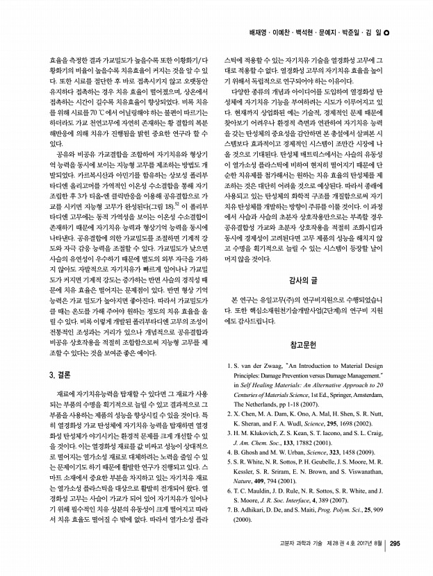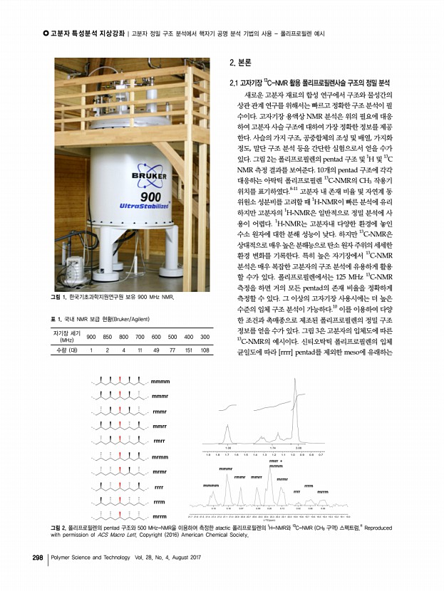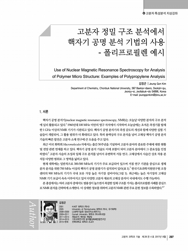 고분자 특성분석 지상강좌 고분자 과학과 기술 제 28 권 4 호 2017년 8월 297 김정곤 2001 KAIST 화학과 학사 2005 University of Pennsylvania 화학과 박사, 유기화학 2006-2009 LG화학기술원 정보전자소재연구소 2009-2011 Cornell University 화학과 박사후과정 2011-2014 제일모직 케미칼 개발팀 2014-2015 기초과학연구원 분자활성촉매반응연구단 2015-현재 전북대학교 화학과 조교수 고분자 정밀 구조 분석에서 핵자기 공명 분석 기법의 사용 폴리프로필렌 예시 Use of Nuclear Magnetic Resonance Spectroscopy for Analysis of Polymer Micro StructureExamples of Polypropylene Analysis 김정곤 | Jeung Gon Kim Department of Chemistry, Chonbuk National University, 567 Baekje-daero, Deokjin-gu, Jeonju-si, Jeollabuk-do 54896, Korea E-mailjeunggonkim@jbnu.ac.kr 1. 서론 핵자기 공명 분석기 nuclear magnetic resonance spectroscopy, NMR 는 오늘날 다양한 분자의 구조 분석 에...