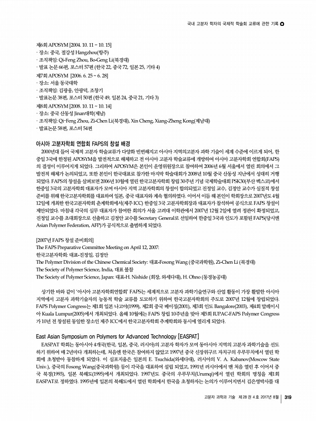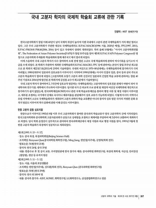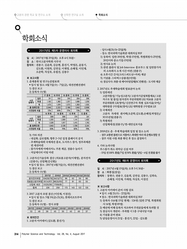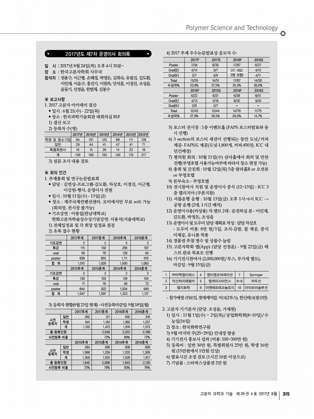 고분자 과학과 기술 제 28 권 4 호 2017년 8월 315 2017추계 2017춘계 2016추계 2016춘계 기조강연 2 2 5 2 특강 115 102 256 107 oral 59 70 128 64 poster 839 855 1,111 910 합 계 1,015 1,029 1,500 1,083 2015추계 2015춘계 2014추계 2014춘계 기조강연 2 2 2 2 특강 130 103 129 104 oral 71 70 58 72 poster 844 922 1,034 949 합 계 1,047 1,097 1,223 1,127 2017추계 2017춘계 2016추계 2016춘계 사전 등록자 일반 262 311 592 316 학생 841 1,162 1,382 1,257 계 1,103 1,473 1,974 1,573 총 등록인원 2,046 2,222 2,188 사전등록 비율 72% 89% 72% 2015추계 2015춘계 2014추계 2014춘계 사전 등록자 일반 284 296 308 308 학생 1,066 1,259 1,220 1,309 계 1,350 1,555 1,528 1,617 총 등록인원 1,842 2,006 1,843 2,126 사전등록 비율 73% 78% 83% 76% 2017F 2017S 2016F 2016S Poster 7/34 8/35 17/67 6/27 Oral E 4/14 3/7 17RSC 2명 포함 4/12 Oral K 2/7 3/9 4/11 Total 13/55 14/51 17/67 14/50 수상자% 23.6% 27.5% 25.4% 28.0% 2015F 2015...