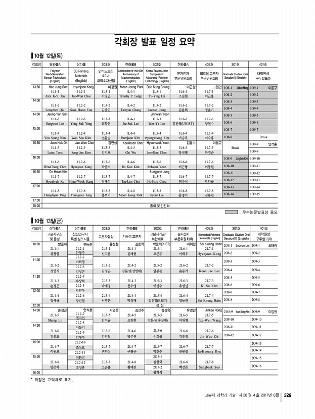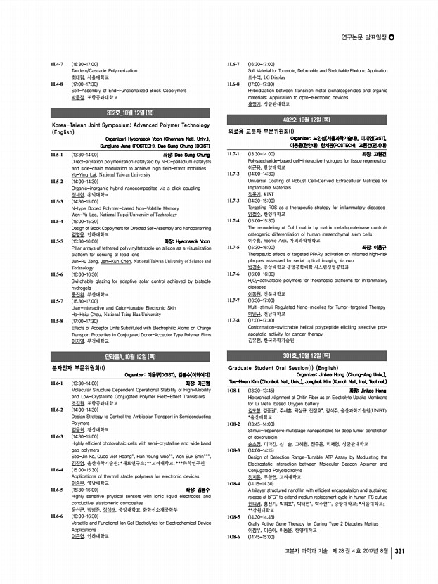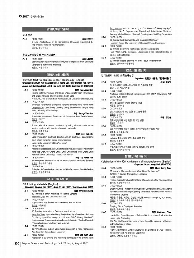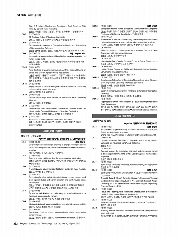 2017 추계학술대회 332 Polymer Science and Technology Vol. 28, No. 4, August 2017 Giant 3-D Network Structure and Templates in Block Copolymer Thin Films by Solvent Vapor Annealing 김영식, 박성민, 이우섭, 유필진*, 류두열, 연세대학교; *성균관대학교 1O8-7 1500-1515 3D Printable Nylon-6/Graphene Composite 안응진, 김병수*, 울산과학기술원; *울산과학기술원 화학과 1O8-8 1515-1530 Simultaneous Improvement in Charge Carrier Mobility and Stretchability of Semiconducting Polymers 손성윤, 김예별, 김재한*, 송은주, 최경원, 이주현, 박태호, POSTECH; *KAIST 1O8-9 1600-1615 좌장Jongbok Kim Unconventional nanopatterning and hierarchical nanostructure generation by metal-coated mold 김종욱, 김광수*, 유필진*, 김태일, 성균관대학교, 뇌과학이미징연구단; *성균관대학교 1O8-10 1615-1630 Nano-Confined Organic Semiconductors and Their Electrical Doping for Stable and Efficient Optoelectronic Applications ...