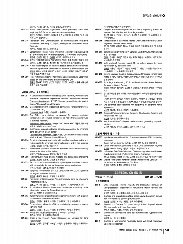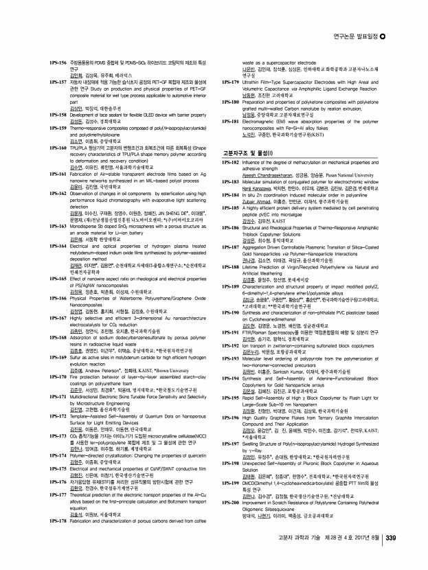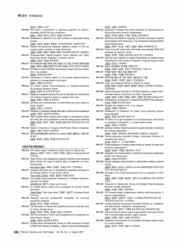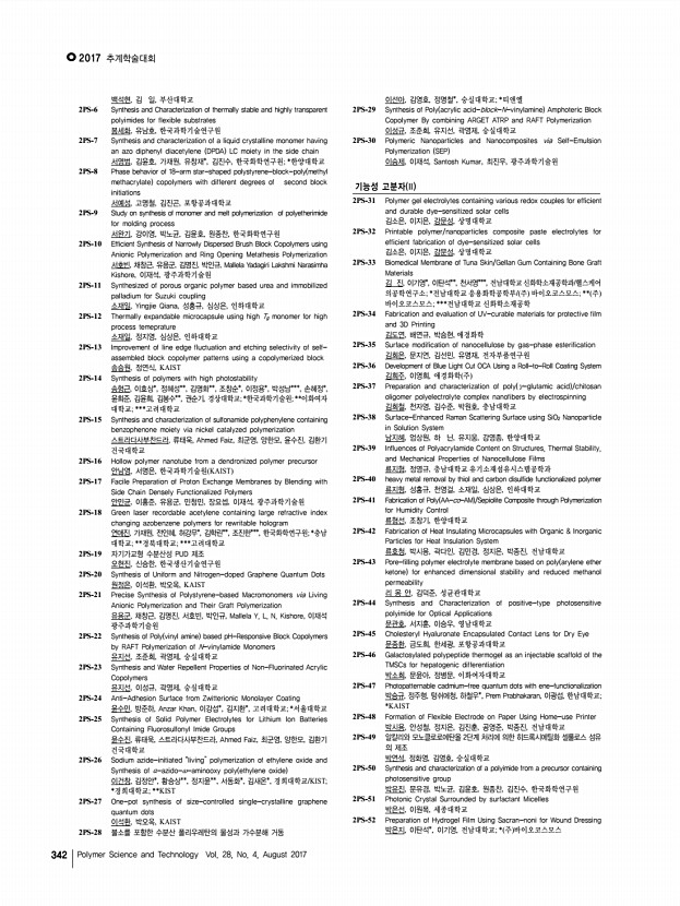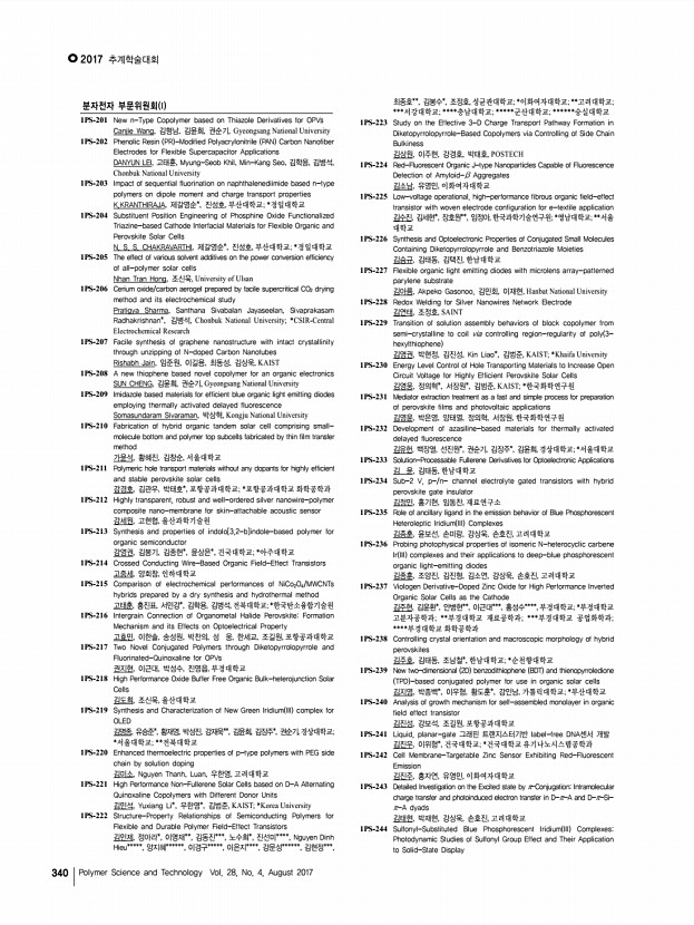 ...l properties via solutionprocessed PEDOTPSS acid ultrafiltration 김영노, 조한결, 정민석, 조원석, 김중현, 연세대학교 1PS-110 Development of optical film with multi-functional by using single-coating process 김영삼, 송정섭, 장순호*, 문광길*, 주 케이엔더블유; *솔베이코리아 1PS-111 Peptide film-polypyrrole supported palladium catalyst for one pot aqueous phase synthesis of indole derivatives 김영오, 유재명*, 장형석*, 정용채, 이윤식*, 한국과학기술연구원; *서울대학교 1PS-112 Photopatternable Organic-Inorganic Hybrid Materials with Highly Fluorinated Polymer Dispersed in Fluorous Solvent 김영태, 손종찬, 이진균, 인하대학교 1PS-113 M13 박테리오파지를 이용한 생체 모방형 자기 조립 구조체의 광학적 응용 김원근, 김춘태, 김인홍, 응유엔 타인 미언, 한영희, 조수진, 오진우,부산대학교 1PS-114 Synthesis of porous PS/PMMA microspheres through pickering emulsion and...