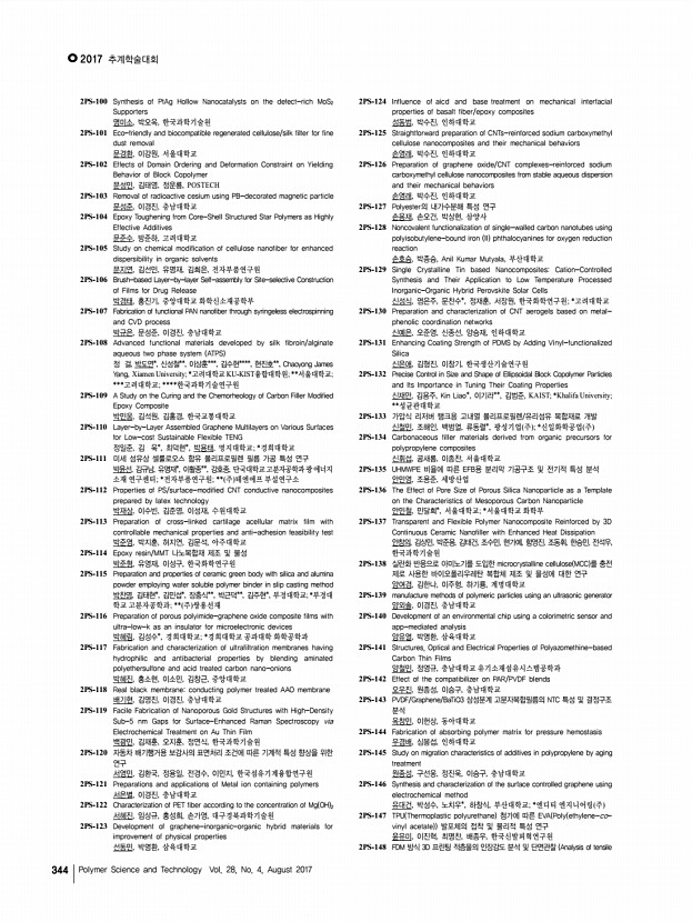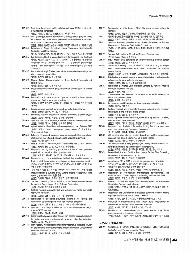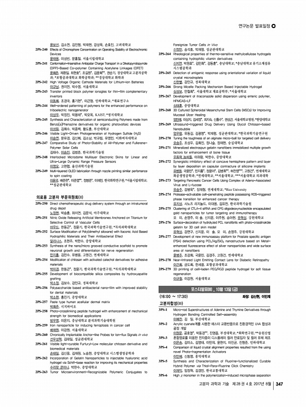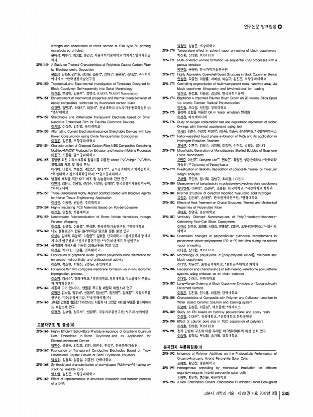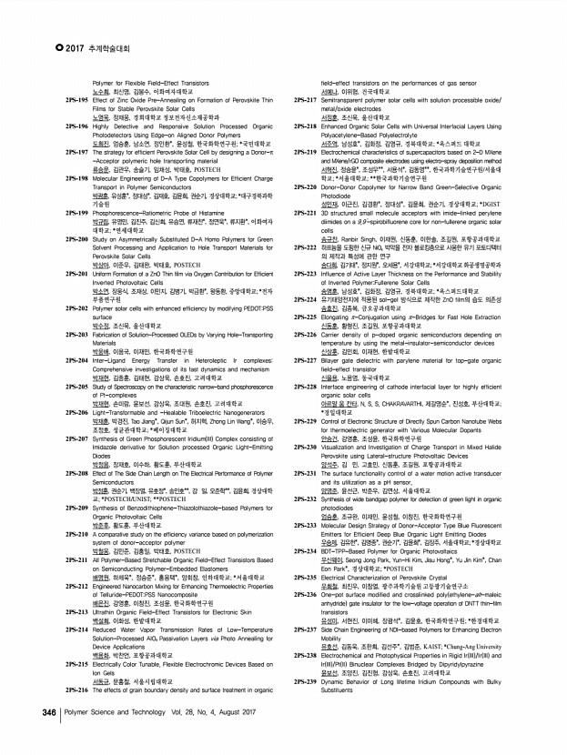 ...mers 도희진, 엄승훈, 남소연, 정인환*, 윤성철, 한국화학연구원; *국민대학교 2PS-197 The strategy for efficient Perovskite Solar Cell by designing a Donor-π -Acceptor polymeric hole transporting material 류승운, 김관우, 송슬기, 임채성, 박태호, POSTECH 2PS-198 Molecular Engineering of D-A Type Copolymers for Efficient Charge Transport in Polymer Semiconductors 박광훈, 유성훈*, 정대성*, 김재호, 김윤희, 권순기, 경상대학교; *대구경북과학 기술원 2PS-199 Phosphorescence-Ratiometric Probe of Histamine 박규림, 유영민, 김진주, 김신희, 유승연, 류재찬*, 정연욱*, 류지환*, 이화여자 대학교; *연세대학교 2PS-200 Study on Asymmetrically Substituted D-A Homo Polymers for Green Solvent Processing and Application to Hole Transport Materials for Perovskite Solar Cells 박상아, 이준우, 김태완, 박태호, POSTECH 2PS-201 Uniform Formation of a ZnO Thin film via Oxygen Contribution for Efficient ...
