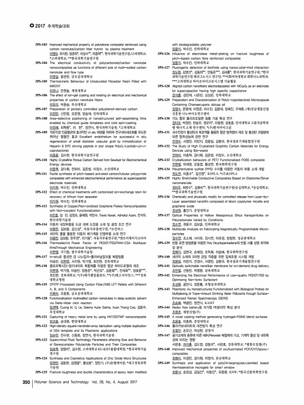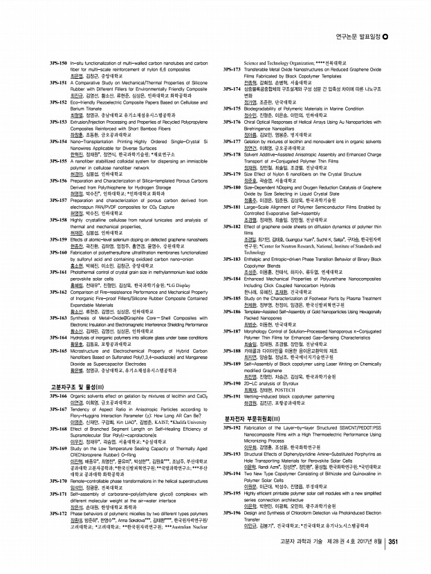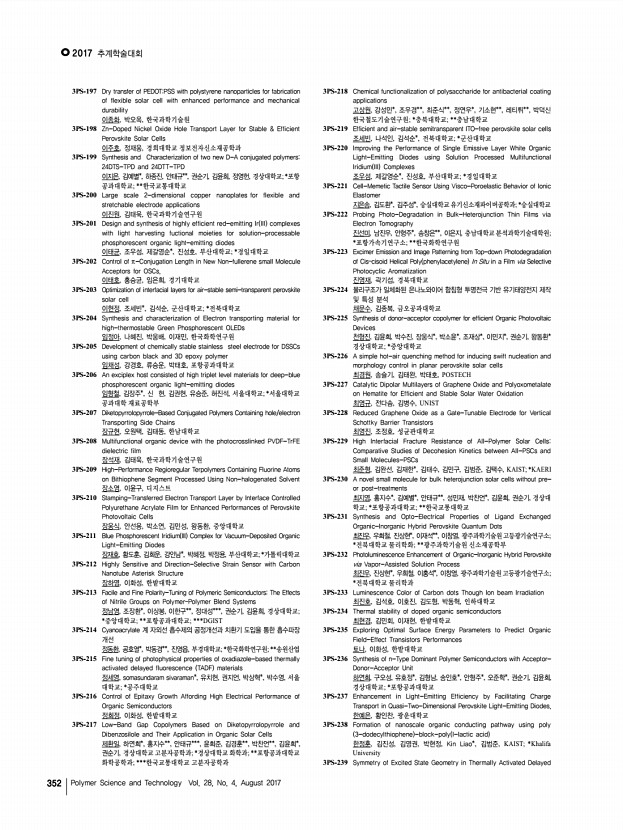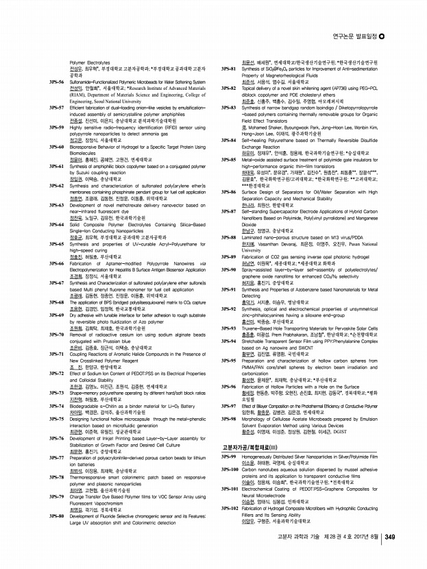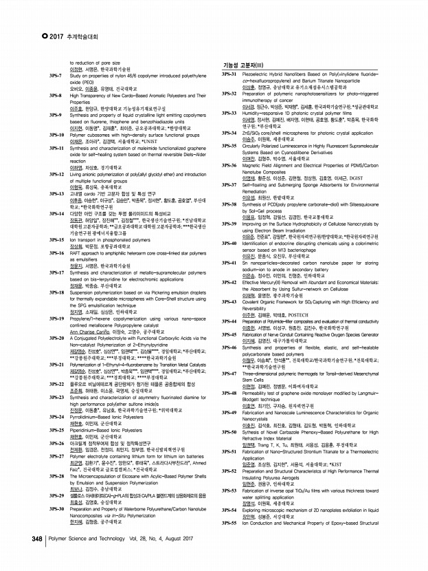 2017 추계학술대회 348 Polymer Science and Technology Vol. 28, No. 4, August 2017 to reduction of pore size 이정현, 서명은, 한국과학기술원 3PS-7 Study on properties of nylon 46/6 copolymer introduced polyethylene oxide PEO 오비오, 이종윤, 유영태, 건국대학교 3PS-8 High Transparency of New Cardo-Based Aromatic Polyesters and Their Properties 이주호, 한양규, 한양대학교 기능성유기재료연구실 3PS-9 Synthesis and property of liquid crystalline light emitting copolymers based on fluorene, thiophene and benzothiadiazole units 이지현, 이동명*, 김재훈*, 최이준, 금오공과대학교; *한양대학교 3PS-10 Polymer cubosomes with high-density surface functional groups 이채은, 조아라*, 김경택, 서울대학교; *UNIST 3PS-11 Synthesis and characterization of maleimide functionalized graphene oxide for self-healing system based on thermal reversible Diels-Alder reaction 이하영, 차상호, 경기대학교 3PS-12 Living anion...