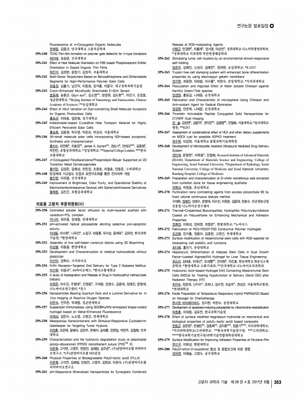 연구논문 발표일정 고분자 과학과 기술 제 28 권 4 호 2017년 8월 353 Fluorescence of π-Conjugated Organic Molecules 한혜림, 김응건, 단국대학교 고분자공학과 3PS-240 TCNQ Thin-film formation on polymer gate dielectric for n-type transistors 허미애, 표승문, 건국대학교 3PS-241 Effect of Host Molecule Orientation on Pt II based Phosphorescent Emitter Orientation in Doped Organic Thin Films 허진석, 김권현, 문창기, 김장주, 서울대학교 3PS-242 Multi-Donor Terpolymers Based on Benzodithiophene and Dithienosilole Segments for High-Performance Polymer Solar Cells 허효정, 김홍기, 남건익, 이동화, 장석훈, 이윤구, 대구경북과학기술원 3PS-243 Crack-Enhanced Microfluidic Stretchable E-Skin Sensor 호동해, 송륜근, Qijun sun*, 김소영**, 방창현, 김도환**, 이진기, 조정호, 성균관대학교; *Beijing Institute of Nanoenergy and Nanosystems, Chinese Academy of Sciences; **숭실대학교 3PS-244 Effe...