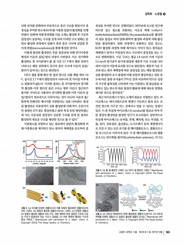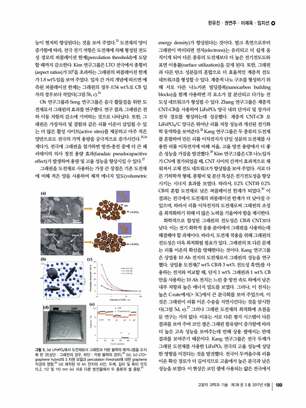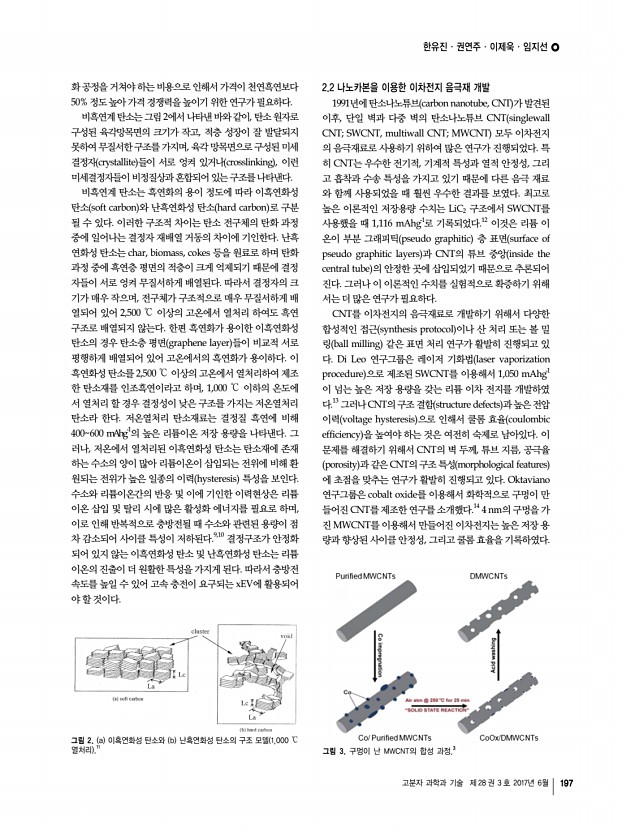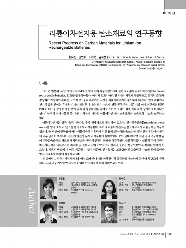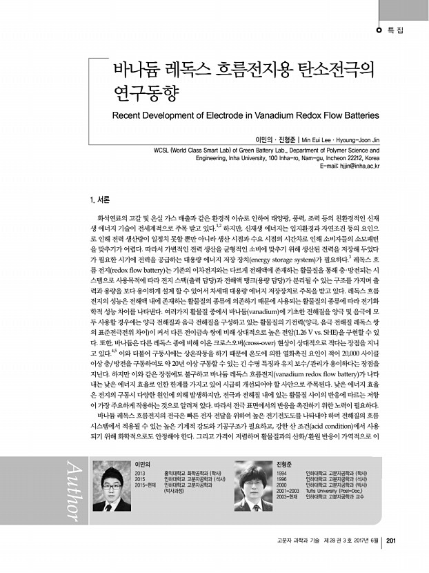 특 집 고분자 과학과 기술 제 28 권 3 호 2017년 6월 201 바나듐 레독스 흐름전지용 탄소전극의 연구동향 Recent Development of Electrode in Vanadium Redox Flow Batteries 이민의ㆍ진형준 | Min Eui LeeㆍHyoung-Joon Jin WCSL World Class Smart Lab of Green Battery Lab., Department of Polymer Science and Engineering, Inha University, 100 Inha-ro, Nam-gu, Incheon 22212, Korea E-mailhjjin@inha.ac.kr 이민의 2013 홍익대학교 화학공학과 학사 2015 인하대학교 고분자공학과 석사 2015-현재 인하대학교 고분자공학과 박사과정 진형준 1994 인하대학교 고분자공학과 학사 1996 인하대학교 고분자공학과 석사 2000 인하대학교 고분자공학과 박사 2001-2003 Tufts University Post-Doc. 2003-현재 인하대학교 고분자공학과 교수 1. 서론 화석연료의 고갈 및 온실 가스 배출과 같은 환경적 이슈로 인하여 태양광, 풍력, 조력 등의 친환경적인 신재 생 에너...
