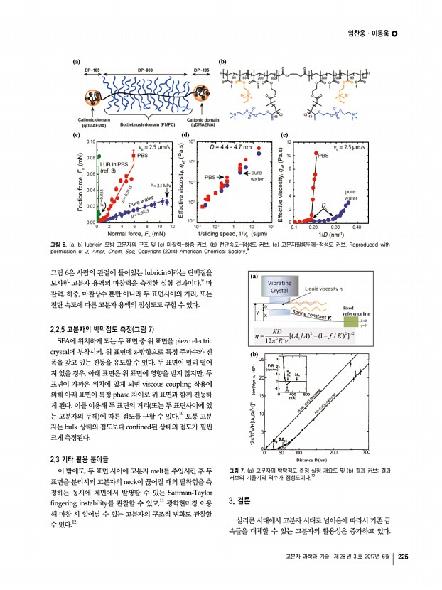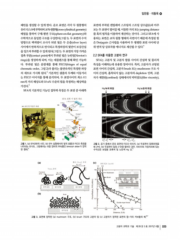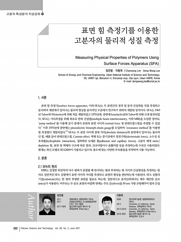 고분자 특성분석 지상강좌 222 Polymer Science and Technology Vol. 28, No. 3, June 2017 임찬웅 2011 경북대학교 생명공학부 학사 2017 포항공과대학교 시스템생명공학부 석사, 박사 통합 2017-현재 울산과학기술원 에너지 및 화학공학부 Post-Doc. 이동욱 2008 한국과학기술원 생명화학공학과 학사 2014 University of California, Santa Barbara, 화학공학과 박사 2014-2016 University of California, Santa Barbara, 화학공학과 Post-Doc. 2016-현재 울산과학기술원 에너지 및 화학공학부 조교수 표면 힘 측정기를 이용한 고분자의 물리적 성질 측정 Measuring Physical Properties of Polymers Using Surface Forces Apparatus SFA 임찬웅ㆍ이동욱 | Chanoong LimㆍDong Woog Lee School of Energy and Chemical Engineering, Ulsan National Institute of Science and Technology, 50, UNIST-gil, Banyeon-ri, Eonyang-eup, Ulju-gun, Ulsan 44919, Korea E-maildongwoog.lee@unist.ac.kr 1. 서론 표면 ...