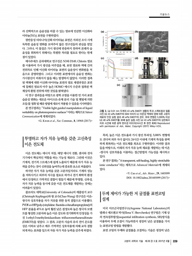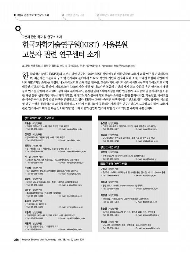 고분자 관련 학교 및 연구소 소개 산학연 연구실 소개 2017년도 추계 학회상 후보자 공모 236 Polymer Science and Technology Vol. 28, No. 3, June 2017 한 고분자 관련 학교 및 연구소 소개 한국과학기술연구원 KIST 서울본원 고분자 관련 연구센터 소개 소재지서울특별시 성북구 화랑로 14길 5 우02792 , 전화02-958-5114, Homepagehttp//www.kist.re.kr 국과학기술연구원 KIST 의 고분자 관련 연구는 1966년 KIST 설립 때부터 대한민국의 고분자 과학 연구를 견인해왔으 며, 최근에는 고분자의 구조 및 전자재료 분야에서 MXene 복합체 기반의 전자파 차폐 소재, 그래핀 복합체 기반의 에 너지 변환/저장 소재 등 다양한 나노하이브리드 소재 개발 연구를, 고분자 기반 에너지 분야에서도 유/무기 하이브리드 박막 태양전지 염료감응, 폴리머, 페로브스카이트 의 기술 개발 및 나노카본 복합체 기...