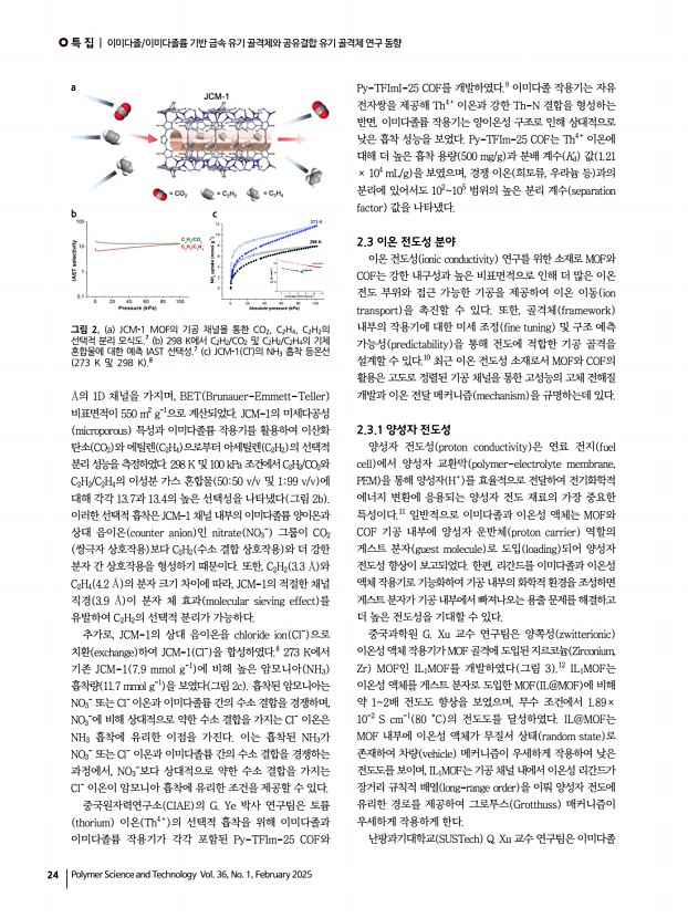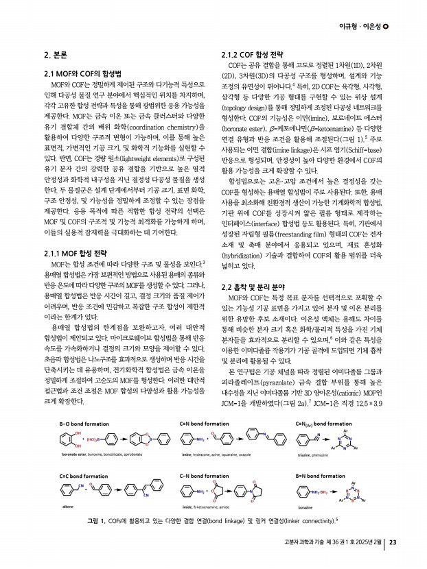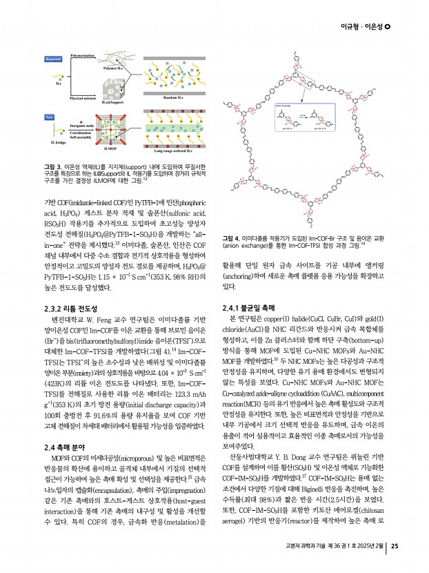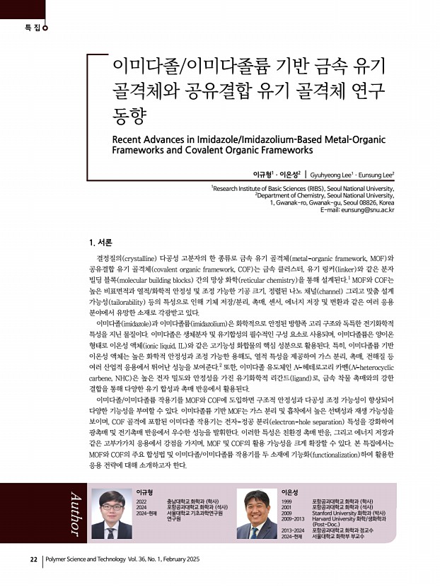 ...연구 동향 Recent Advances in Imidazole/Imidazolium-Based Metal-Organic Frameworks and Covalent Organic Frameworks 이규형1ㆍ이은성2 | Gyuhyeong Lee1ㆍEunsung Lee2 1Research Institute of Basic Sciences RIBS , Seoul National University, 2Department of Chemistry, Seoul National University, 1, Gwanak-ro, Gwanak-gu, Seoul 08826, Korea E-maileunsung@snu.ac.kr Author 이규형 2022 충남대학교 화학과 학사 2024 포항공과대학교 화학과 석사 2024-현재 서울대학교 기초과학연구원 연구원 이은성 1999 포항공과대학교 화학과 학사 2001 포항공과대학교 화학과 석사 2009 Stanford University 화학과 박사 2009-2013 Harvard University 화학/생화학과 Post-Doc. 2013-2024 포항공과대학교 화학과 정교수 2024-현재 서울대학교 화학부부교수