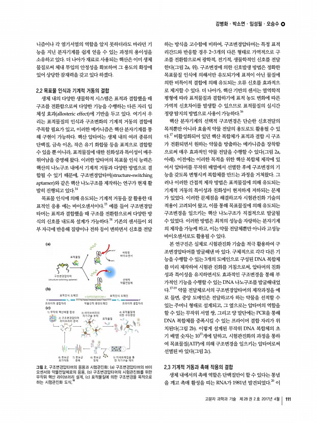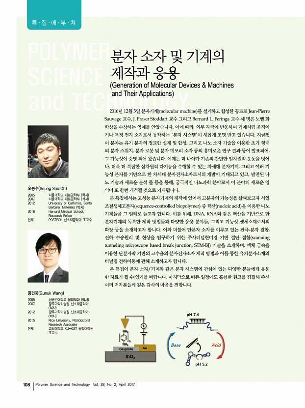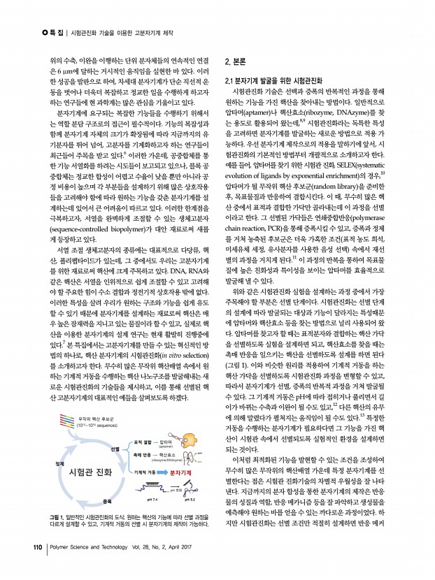 특 집 고분자 과학과 기술 제 28 권 2 호 2017년 4월 109 시험관진화 기술을 이용한 고분자기계 제작 Generation of Macromolecular Machines Using in Vitro Selection Techniques 강병화ㆍ박소연ㆍ임성필ㆍ오승수 | Byung Hwa KangㆍSo Yeon ParkㆍSeong Pil LimㆍSeung Soo Oh Department of Materials Science and Engineering, POSTECH 77, Cheongam-ro, Nam-gu, Pohang-si, Gyeongsangbuk-do 37673, Korea E-mailseungsoo@postech.ac.kr 강병화 2016 고려대학교 신소재공학부 학사 현재 POSTECH 신소재공학과 석/박사 통합과정 박소연 2016 경북대학교 에너지공학부 학사 현재 POSTECH 신소재공학과 석사과정 임성필 2017 고려대학교 신소재공학부 학사 현재 POSTECH 신소재공학과 석사과정 오승수 2005 서울대학교 재료공학부 학사 2007 서울대학교 재료공학부 석사 2012 University of California, Santa Barbara, Materials 박사 2016 Harvard Medical School, Research Fellow 현재 P...