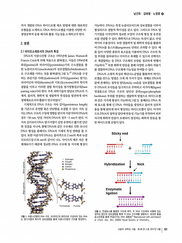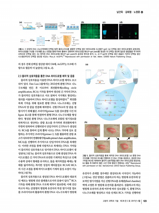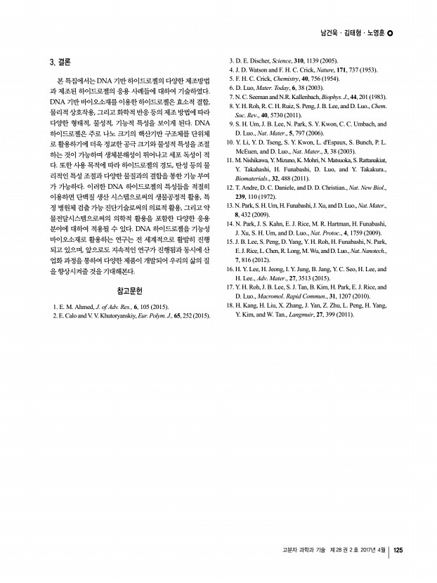 남건욱ㆍ김태형ㆍ노영훈 고분자 과학과 기술 제 28 권 2 호 2017년 4월 125 3. 결론 본 특집에서는 DNA 기반 하이드로젤의 다양한 제조방법 과 제조된 하이드로젤의 응용 사례들에 대하여 기술하였다. DNA 기반 바이오소재를 이용한 하이드로젤은 효소적 결합, 물리적 상호작용, 그리고 화학적 반응 등의 제조 방법에 따라 다양한 형태적, 물성적, 기능적 특성을 보이게 된다. DNA 하이드로젤은 주로 나노 크기의 핵산기반 구조체를 단위체 로 활용하기에 더욱 정교한 공극 크기와 물성적 특성을 조절 하는 것이 가능하며 생체분해성이 뛰어나고 세포 독성이 적 다. 또한 사용 목적에 따라 하이드로젤의 경도, 탄성 등의 물 리적인 특성 조절과 다양한 물질과의 결합을 통한 기능 부여 가 가능하다. 이러한 DNA 하이드로젤의 특성들을 적절히 이용하면 단백질 생산 시...
