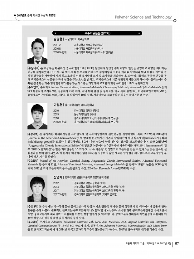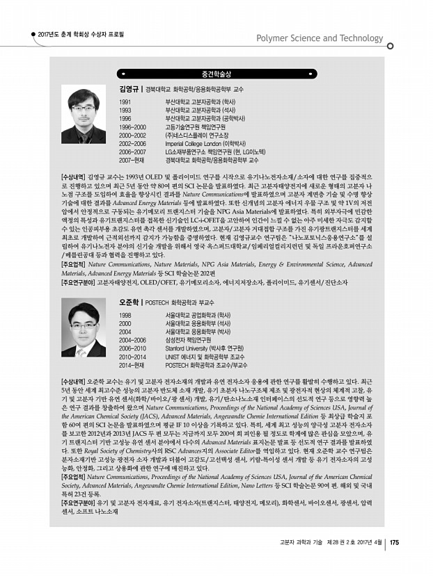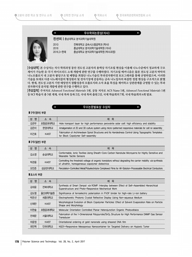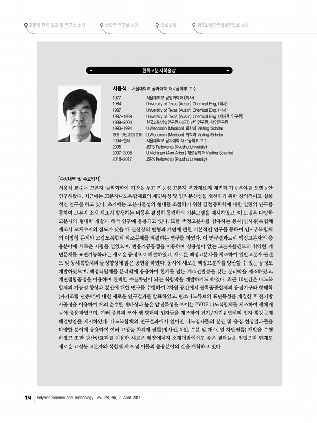 ... 학교 및 연구소 소개 한국화학관련학회연합회 소식 산학연 연구실 소개 학회소식 174 Polymer Science and Technology Vol. 28, No. 2, April 2017 한화고분자학술상 서용석|서울대학교 공과대학 재료공학부 교수 1977 서울대학교 공업화학과 학사 1984 University of Texas Austin Chemical Eng. 석사 1987 University of Texas Austin Chemical Eng. 박사 1987-1989 University of Texas Austin Chemical Eng. 박사후 연구원 1989-2003 한국과학기술연구원 KIST 선임연구원, 책임연구원 1993-1994 U.Wisconsin Madison 화학과 Visiting Scholar 1996, 1998, 2000, 2003 U.Wisconsin Madison 화학과 Visiting Scholar 2004-현재 서울대학교 공과대학 재료공학부 교수 2005 JSPS Fellowship Kyushu University 2007-2008 U.Michigan Ann Arbor 재료공학과 Visiting Scientist 2016-2017 JSPS Fellowship Kyushu University [수상내역 및 주요업적] 서용석 교수는 고분자 물리화학에 기반을 두고 기능...