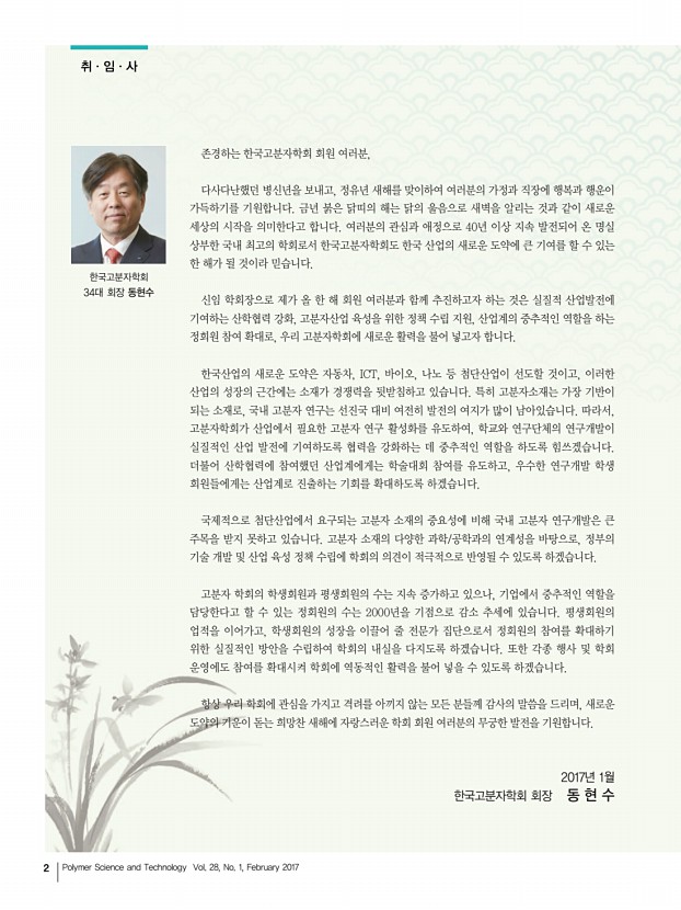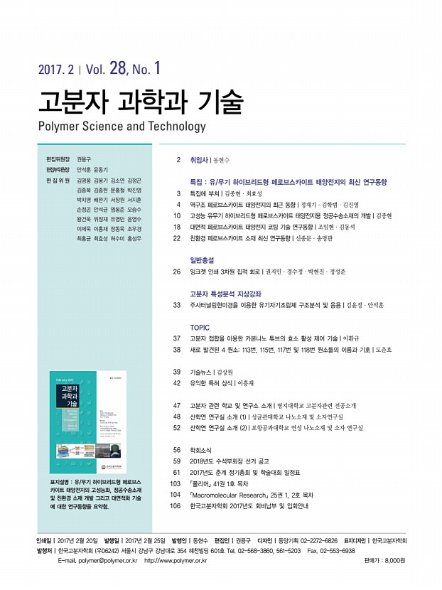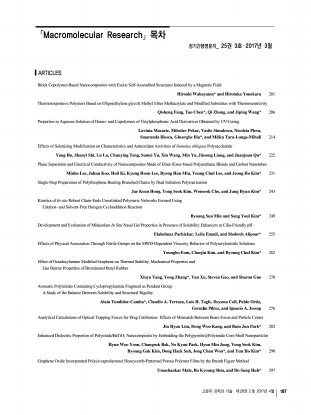 고분자 과학과 기술 제 28권 2 호 2017년 4월 187 「Macromolecular Research」목차 정기간행영문지_ 25권 3호 ․ 2017년 3월 ARTICLES Block Copolymer-Based Nanocomposites with Exotic Self-Assembled Structures Induced by a Magnetic Field Hiroaki Wakayama* and Hirotaka Yonekura 201 Thermoresponsive Polymers Based on Oligo ethylene glycol Methyl Ether Methacrylate and Modified Substrates with Thermosensitivity Qisheng Fang, Tao Chen*, Qi Zhong, and Jiping Wang* 206 Properties in Aqueous Solution of Homo- and Copolymers of Vinylphosphonic Acid Derivatives Obtained by UV-Curing Lavinia Macarie, Miloslav Pekar, Vasile Simulescu, Nicoleta Plesu, Smaranda Iliescu, Gheorghe Ilia*, and Milica Tara-Lunga-Mihali 214 Effects of Selenizing Modification on Characteristics and Antioxidant Activities of Inonotus obliquus Polysaccharide Yang Hu, Shanyi Shi, Lu Lu, Chunying Teng, Sumei Yu, Xin Wang, Min Yu, Jinsong Liang, and Juanjuan Qu* 222 Phase Separation and Electrical Conducti...