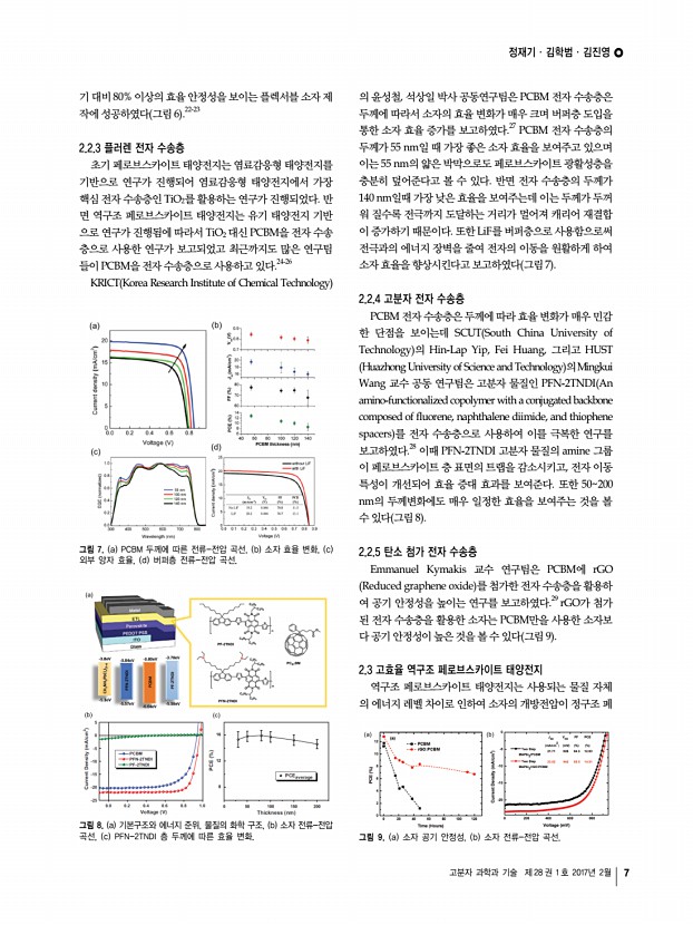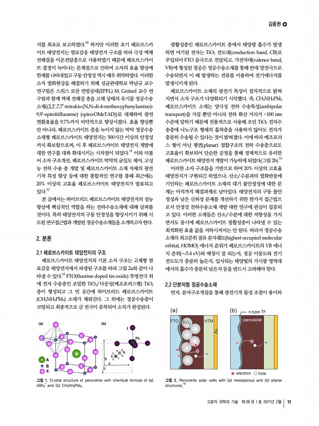정재기ㆍ김학범ㆍ김진영 고분자 과학과 기술 제 28 권 1 호 2017년 2월 9 6. A. Kojima, K. Teshima, Y. Shirai, and T. Miyasaka, J. Am. Chem. Soc., 131, 6050 2009 7. P. Docampo, J. M. Ball, M. Darwich, G. E. Eperon, and H. J. Snaith, Nat. Comm., 4, 2761 2013 8. T. Liu, K. Chen, Q. Hu, R. Zhu, and Q. Gong, Adv. Energy Mater., 6, 1600457 2016 9. J. Jeng, Y. Chiang, M. Lee, S. Peng, T. Guo, P. Chen, and T. Wen, Adv. Mater., 25, 3727 2013 10. N. Jeon, J. H. Noh, Y. C. Kim, W. S. Yang, S. Ryu, and S. I. Seok, Nat. Mater., 13, 897 2014 11. N. J. Jeon, J. H. Noh, W. S. Yang, Y. C. Kim, S. Ryu, J. Seo, and S. I. Seok, Nature, 517, 476 2015 12. Q. Chen, H. Zhou, Z. Hong, S. Luo, H. Duan, H. Wang, Y. Liu, G. Li, and Y. Yang, J. Am. Chem. Soc., 136, 622 2014 13. J. You, Z. Hong, Y. Yang, Q. Chen, M. Cai, T. Song, C. Chen, S. Lu, Y. Liu, H. Zhou, and Y. Yang, ACS Nano, 8, 1674 2014 14. Z. Xiao, C. Bi, Y. Shao, Q. Dong, Q. Wang, Y. Yuan, C. Wang, Y. Gao, and J. Huang, Energy Envir...