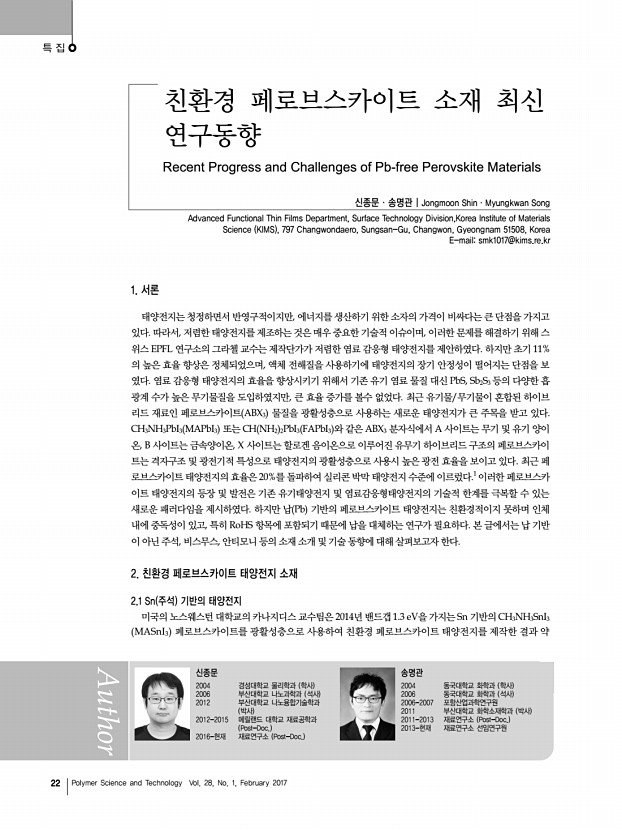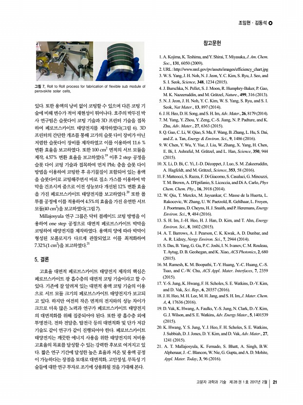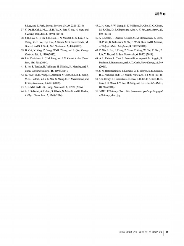 김종현 고분자 과학과 기술 제 28 권 1 호 2017년 2월 17 J. Lee, and T. Park, Energy Environ. Sci., 9, 2326 2016 37. Y. Du, H. Cai, J. Ni, J. Li, H. Yu, X. Sun, Y. Wu, H. Wen, and J. Zhang, RSC Adv., 5, 66981 2015 38. J. H. Heo, S. H. Im, J. H. Noh, T. N. Mandal, C.-S. Lim, J. A. Chang, Y.-H. Lee, H.-j. Kim, A. Sarkar, M. K. Nazeeruddin, M. Gratzel, and S. I. Seok, Nat. Photonics., 7, 486 2013 39. B. Cai, Y. Xing, Z. Yang, W.-H. Zhang, and J. Qiu, Energy Environ. Sci., 6, 1480 2013 40. J. A. Christians, R. C. M. Fung, and P. V. Kamat, J. Am. Chem. Soc., 136, 758 2014 41. S. Ito, S. Tanaka, H. Vahlman, H. Nishino, K. Manabe, and P. Lund, ChemPhysChem., 15, 1194 2014 42. W. Yu, F. Li, H. Wang, E. Alarousu, Y. Chen, B. Lin, L. Wang, M. N. Hedhili, Y. Li, K. Wu, X. Wang, O. F. Mohammed, and T. Wu, Nanoscale, 8, 6173 2016 43. S. S. Mali and C. K. Hong, Nanoscale, 8, 10528 2016 44. A. S. Subbiah, A. Halder, S. Ghosh, N. Mahuli, and G. Hodes, J. Phys. Chem. Lett., 5, 1748 2014 45...
