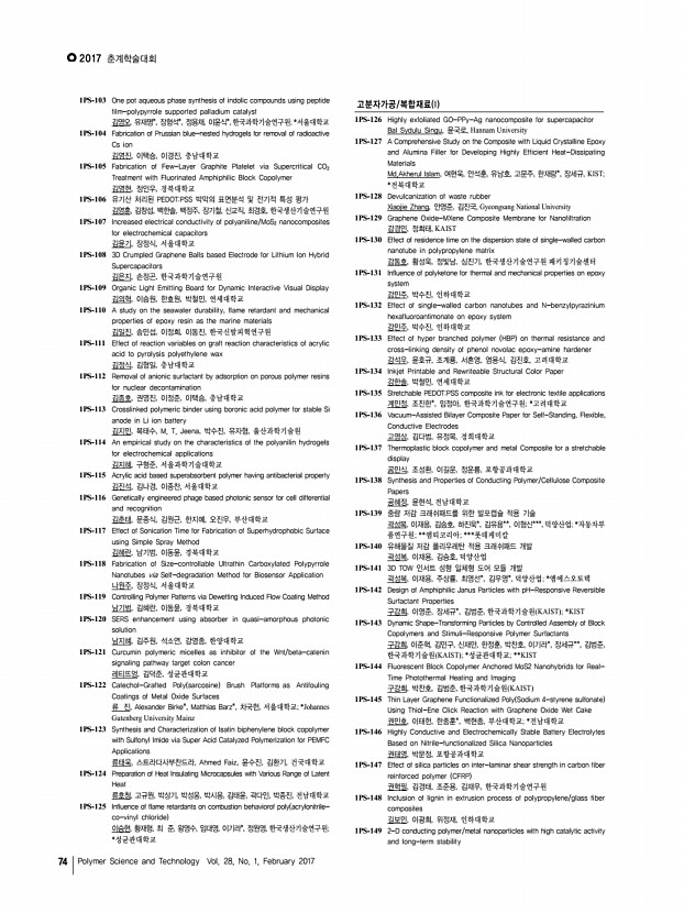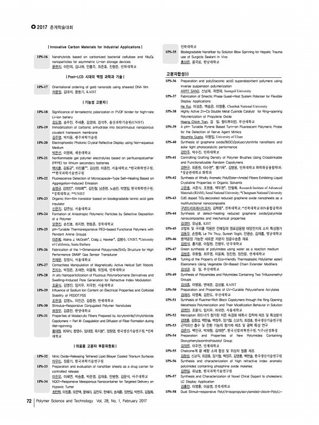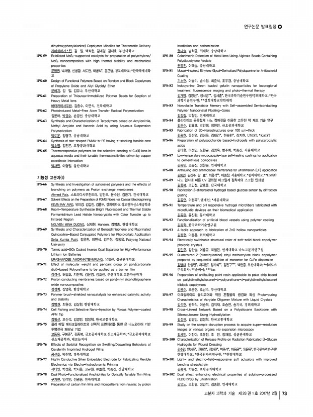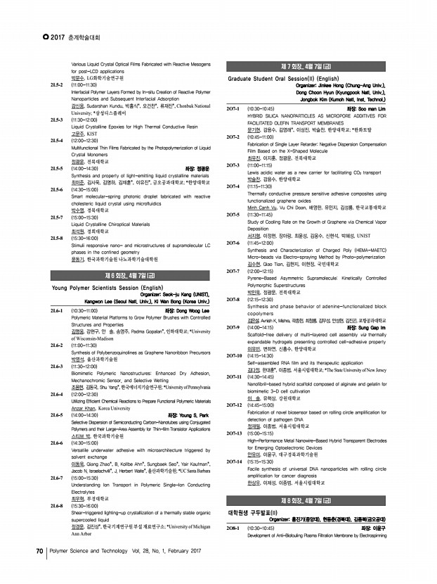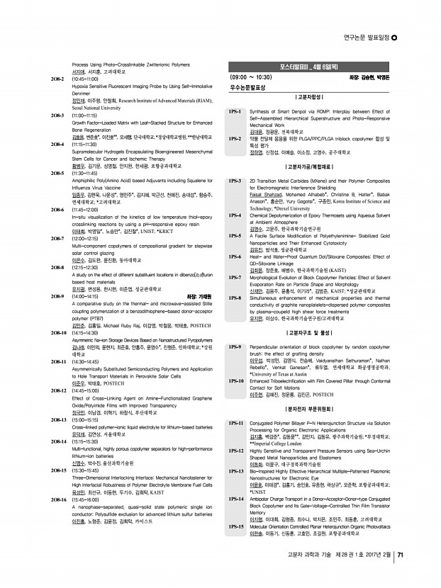 연구논문 발표일정 고분자 과학과 기술 제 28 권 1 호 2017년 2월 71 Process Using Photo-Crosslinkable Zwitterionic Polymers 서지애, 서지훈, 고려대학교 2O8-2 1045-1100 Hypoxia Sensitive Fluorescent Imaging Probe by Using Self-Immolative Denrimer 정인재, 이주형, 안철희, Research Institute of Advanced Materials RIAM , Seoul National University 2O8-3 1100-1115 Growth Factor-Loaded Matrix with Leaf-Stacked Structure for Enhanced Bone Regeneration 김호용, 변준호*, 이진호**, 오세행, 단국대학교; *경상대학교병원; **한남대학교 2O8-4 1115-1130 Supramolecular Hydrogels Encapsulating Bioengineered Mesenchymal Stem Cells for Cancer and Ischemic Therapy 황병우, 김기문, 성영철, 안지완, 한세광, 포항공과대학교 2O8-5 1130-1145 Amphiphilic Poly Amino Acid based Adjuvants including Squalene for Influenza Virus Vaccine 임종우, 김현욱, 나운성*, 염민주*, 김지혜, 박근선, 천해진, 송대섭*, 함승주, ...