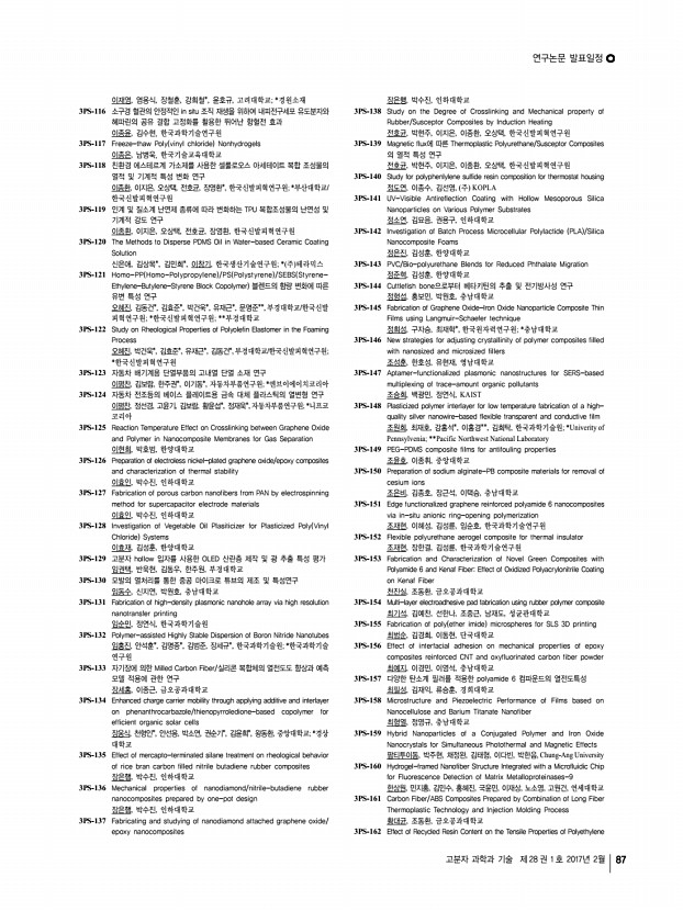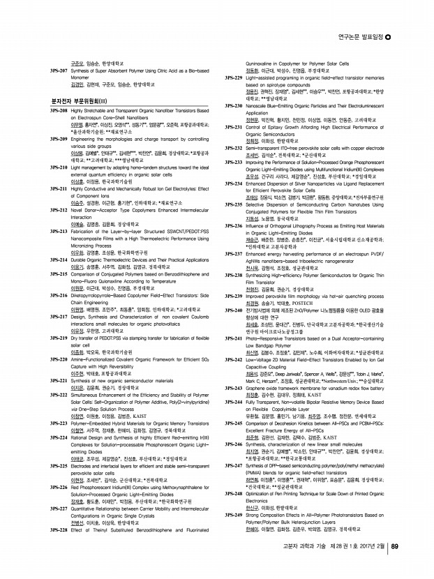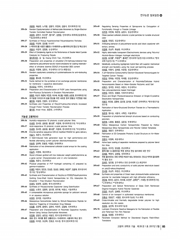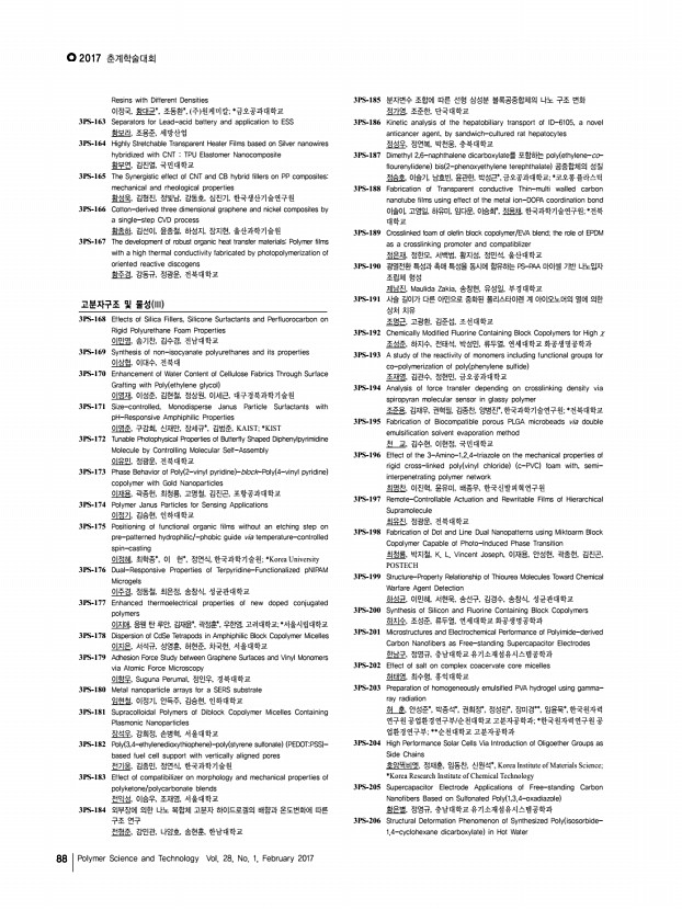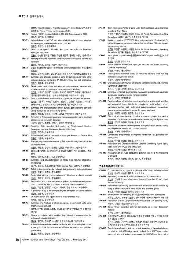 ..., 김영수, 이대수*, KIST 전북분원; *전북대학교 화학공학부 3PS-77 Synthesis and characterization of semi-crystalline poly arylene ether ketone s polymer containing 6F-BPA for moiety fuel cell application 정종언, 이동훈, 위덕대학교 3PS-78 Development and characterization of polypropylene blended with styrene-grafted polyurethane using gamma-irradiation 정진오, 박종석*, 안성준*, 정성린*, 권희정*, 이재영**, 임윤묵*, 한국원자력 연구원/광주과학기술원; *한국원자력연구원; **광주과학기술원 3PS-79 D-Isosorbide based reactive chiral dopant for temperature sensor 정혜인, 이은옥*, 최미진*, 전인혜*, 김진수*, 김윤호*, 김은경**, 가재원*, 한국화학연구원/연세대학교; *한국화학연구원; **연세대학교 3PS-80 Synthesis and characterization of UV-curable poly urethane-acrylate using diacrylates as crosslinking points 정효진, 허필호, 강경석, 지찬혁, 김은영, 부산대학...