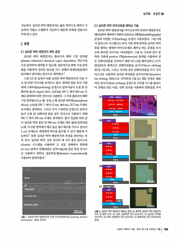 남지윤ㆍ조성진 고분자 과학과 기술 제 27 권 6 호 2016년 12월 791 a b 그림 6. 마이크로셀을 이용하여 제작된 신축성 실리콘 박막 태양전지의 외부 응력에 따른 태양전지 특성 변화a 외부 응력에 따른 태양전지 전류-전압 그래프, b 외부 응력에 따른 태양전지 특성 차이. a b c d e f 그림 5. 신축성 실리콘 박막 태양전지 간의 구불구불한 구조의 상호 연결 전극의 현미경 사진. 외부 응력이 a 0%, b 10%, c 20%, d 30%, e 40%, f 50% 가해졌을 때 신축된 연결 전극의 모습. 체 신축성 태양전지 소자의 크기도 가로세로 1.5 cm × 1.5 cm 정도 이며, 49개의 태양전지 셀을 포함하고 있다.12 구불구불한 형태의 신축성 구조의 경우, 각각의 독립된 태 양전지 셀을 상호 연결 전극 interconnection electrode 을 이용하여 연결하는데, 이때 연결 전극의 구조를 구불구불한 형태로 만들어 외부 응력...