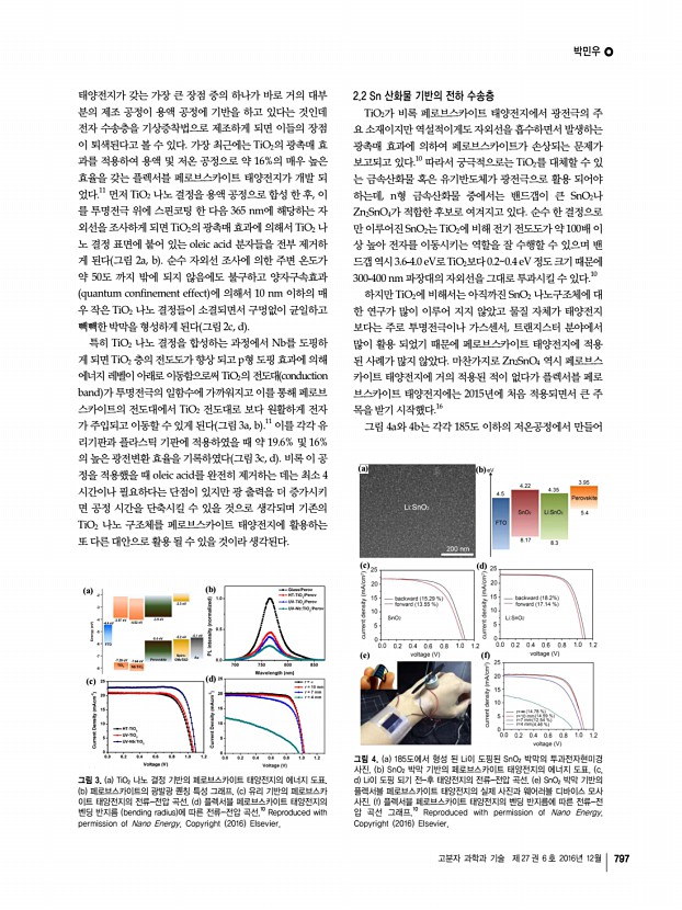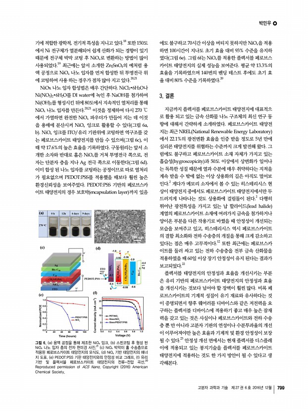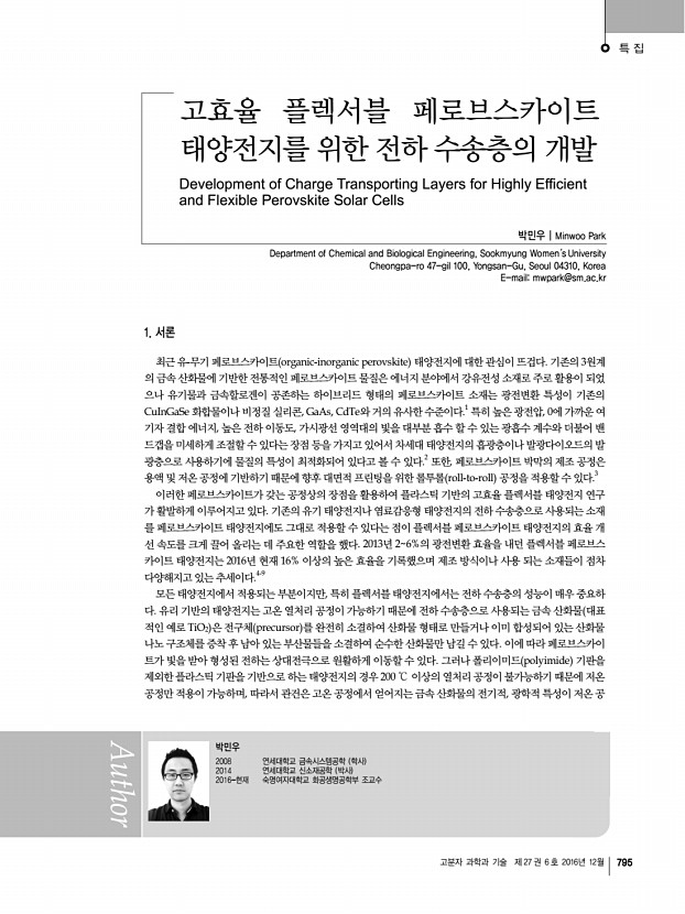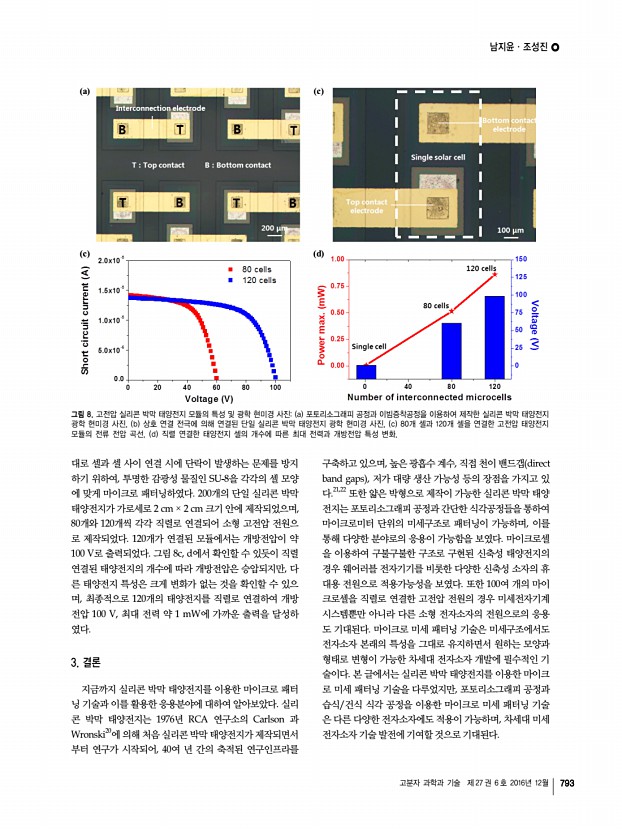 남지윤ㆍ조성진 고분자 과학과 기술 제 27 권 6 호 2016년 12월 793 a c c d 그림 8. 고전압 실리콘 박막 태양전지 모듈의 특성 및 광학 현미경 사진a 포토리소그래피 공정과 이빔증착공정을 이용하여 제작한 실리콘 박막 태양전지 광학 현미경 사진, b 상호 연결 전극에 의해 연결된 단일 실리콘 박막 태양전지 광학 현미경 사진, c 80개 셀과 120개 셀을 연결한 고전압 태양전지 모듈의 전류 전압 곡선, d 직렬 연결한 태양전지 셀의 개수에 따른 최대 전력과 개방전압 특성 변화. 대로 셀과 셀 사이 연결 시에 단락이 발생하는 문제를 방지 하기 위하여, 투명한 감광성 물질인 SU-8을 각각의 셀 모양 에 맞게 마이크로 패터닝하였다. 200개의 단일 실리콘 박막 태양전지가 가로세로 2 cm × 2 cm 크기 안에 제작되었으며, 80개와 120개씩 각각 직렬로 연결되어 소형 고전압 전...