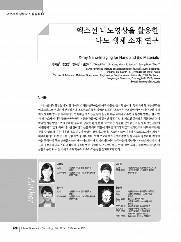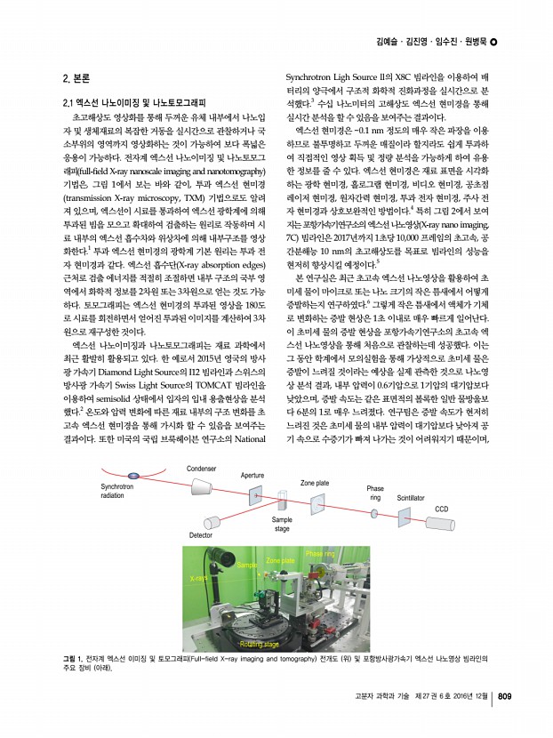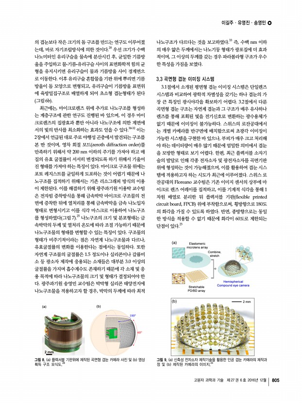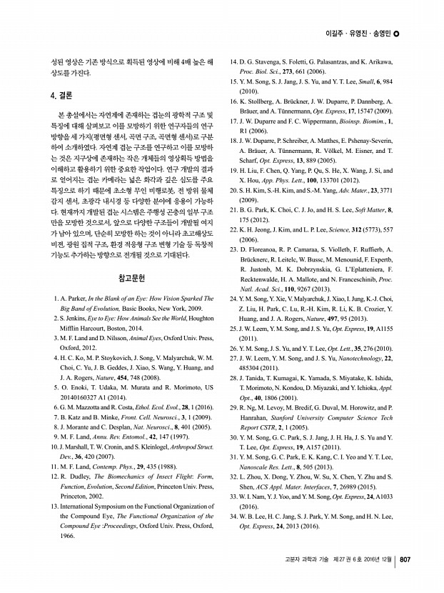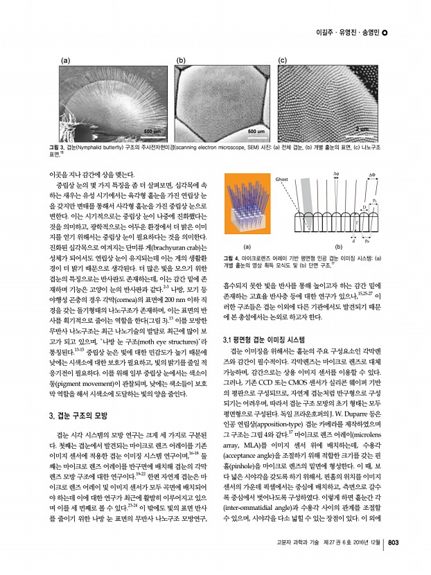 이길주ㆍ유영진ㆍ송영민 고분자 과학과 기술 제 27 권 6 호 2016년 12월 803 그림 4. 마이크로렌즈 어레이 기반 평면형 인공 겹눈 이미징 시스템a 개별 홑눈의 영상 획득 모식도 및 b 단면 구조.17 그림 3. 겹눈 Nymphalid butterfly 구조의 주사전자현미경 scanning electron microscope, SEM 사진a 전체 겹눈, b 개별 홑눈의 표면, c 나노구조 표면.13 이곳을 지나 감간에 상을 맺는다. 중립상 눈의 몇 가지 특징을 좀 더 살펴보면, 십각목에 속 하는 새우는 유성 시기에서는 육각형 홑눈을 가진 연립상 눈 을 갖지만 변태를 통해서 사각형 홑눈을 가진 중립상 눈으로 변한다. 이는 시기적으로는 중립상 눈이 나중에 진화했다는 것을 의미하고, 광학적으로는 어두운 환경에서 더 밝은 이미 지를 얻기 위해서는 중립상 눈이 필요하다는 것을 의미한다. 진화된 십각목으로 여겨지는 단미...