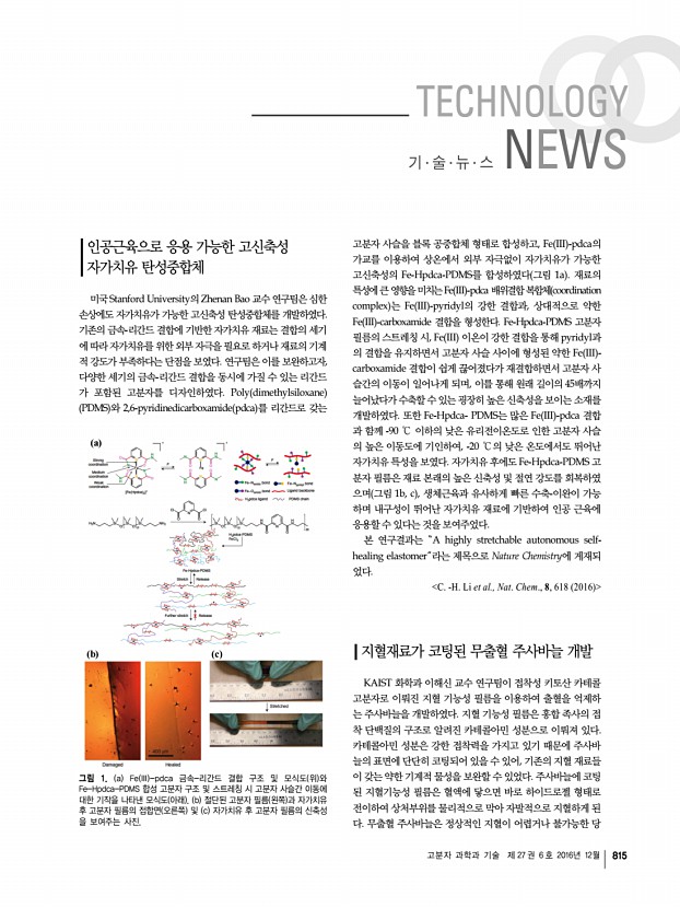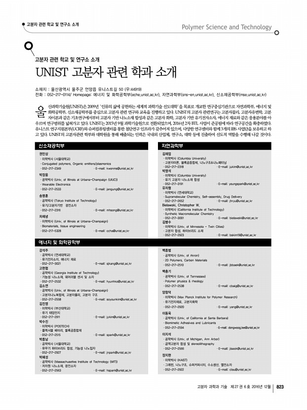 고분자 과학과 기술 제 27 권 6 호 2016년 12월 823 울 고분자 관련 학교 및 연구소 소개 UNIST 고분자 관련 학과 소개 소재지 울산광역시 울주군 언양읍 유니스트길 50 우44919 전화 052-217-0114/ Homepage에너지 및 화학공학부 eche.unist.ac.kr , 자연과학부 sns-en.unist.ac.kr , 신소재공학부 mse.unist.ac.kr 산과학기술원 UNIST 은 2009년‘인류의 삶에 공헌하는 세계적 과학기술 선도대학’을 목표로 개교한 연구중심기관으로 자연과학부, 에너지 및 화학공학부, 신소재공학부를 중심으로 고분자 관련 연구와 교육을 진행하고 있다. UNIST의 고분자 관련연구는 고분자물리, 고분자유변학, 고분 자이론과 같은 기초연구에서부터 고분자 기반 나노소재 합성과 같은 고분자 화학, 고분자 기반 유기전자소자, 에너지 재료와 같은 응용분야를 아 우르며 연구범위를 넓혀가고 있다. UNIST는 20...