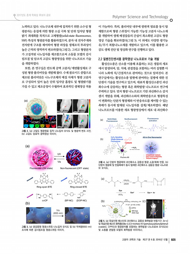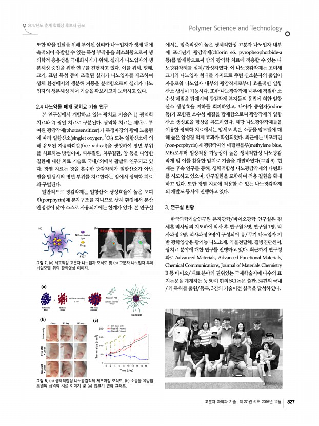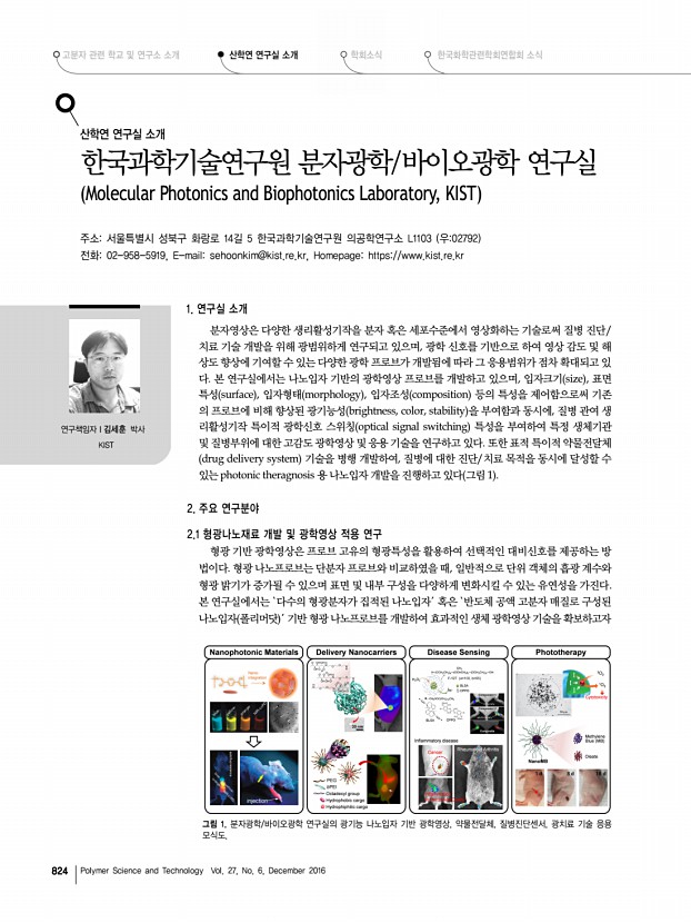 고분자 관련 학교 및 연구소 소개 학회소식 산학연 연구실 소개 한국화학관련학회연합회 소식 824 Polymer Science and Technology Vol. 27, No. 6, December 2016 연구책임자l김세훈 박사 KIST 그림 1. 분자광학/바이오광학 연구실의 광기능 나노입자 기반 광학영상, 약물전달체, 질병진단센서, 광치료 기술 응용 모식도. 산학연 연구실 소개 한국과학기술연구원 분자광학/바이오광학 연구실 Molecular Photonics and Biophotonics Laboratory, KIST 주소서울특별시 성북구 화랑로 14길 5 한국과학기술연구원 의공학연구소 L1103 우02792 전화02-958-5919, E-mailsehoonkim@kist.re.kr, Homepagehttps//www.kist.re.kr 1. 연구실 소개 분자영상은 다양한 생리활성기작을 분자 혹은 세포수준에서 영상화하는 기술로써 질병 진단/ 치료 기술 개발을 위해 광범위하게 연구되고 있으며, 광학 신호를 기반으로 하여 영상 감...