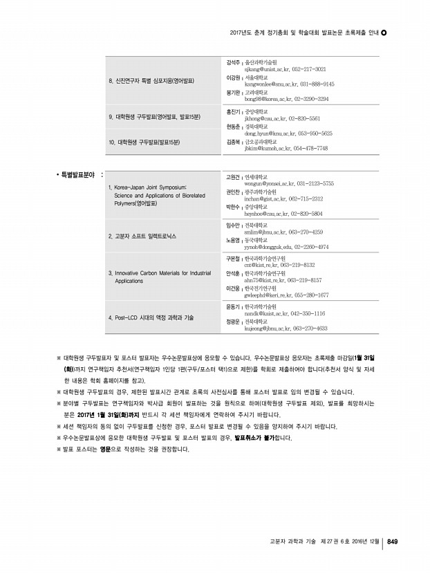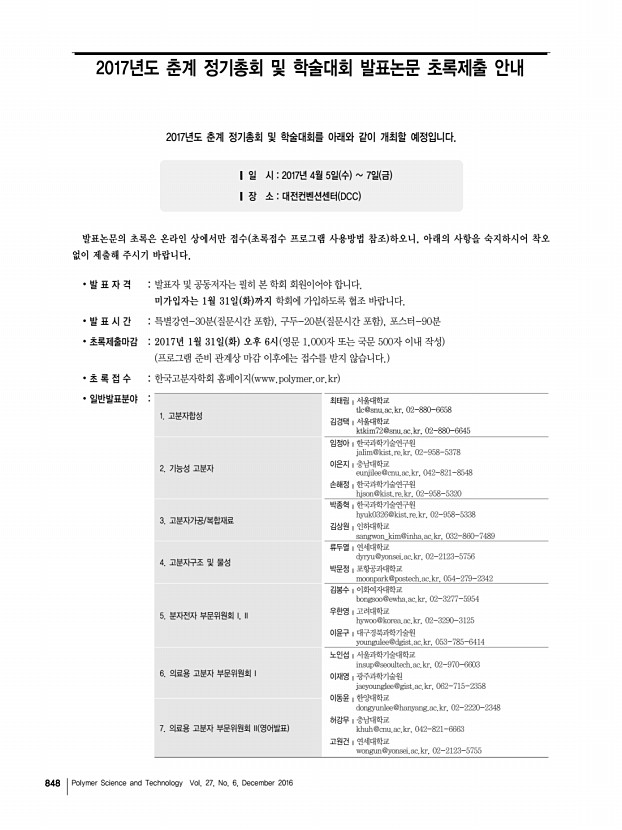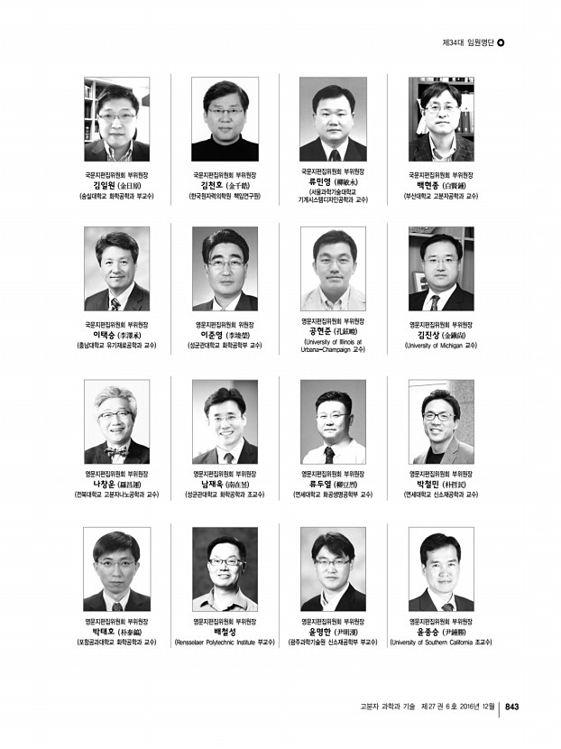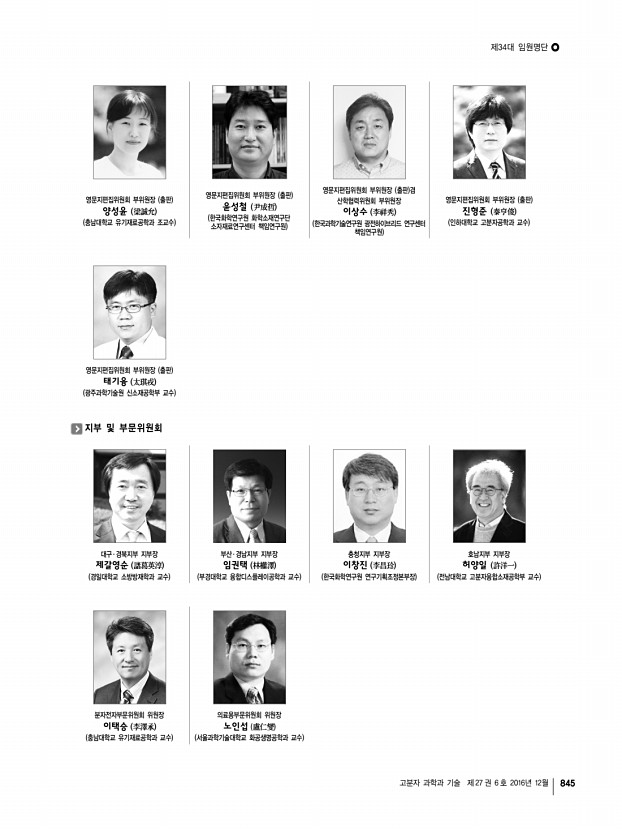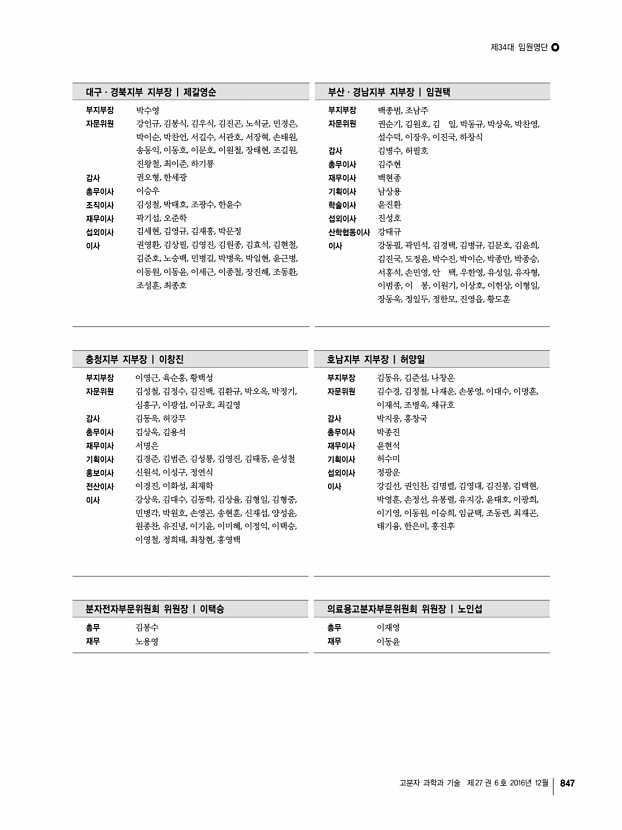 제34대 임원명단 고분자 과학과 기술 제 27 권 6 호 2016년 12월 847 대구ㆍ경북지부 지부장 | 제갈영순 부산ㆍ경남지부 지부장 | 임권택 부지부장 자문위원 감사 총무이사 조직이사 재무이사 섭외이사 이사 박수영 강인규, 김봉식, 김우식, 김진곤, 노석균, 민경은, 박이순, 박찬언, 서길수, 서관호, 서장혁, 손태원, 송동익, 이동호, 이문호, 이원철, 장태현, 조길원, 진왕철, 최이준, 하기룡 권오형, 한세광 이승우 김성철, 박태호, 조광수, 한윤수 곽기섭, 오준학 김세현, 김영규, 김재홍, 박문정 권영환, 김상필, 김영진, 김원종, 김효석, 김현철, 김준호, 노승백, 민병길, 박병욱, 박일현, 윤근병, 이동원, 이동윤, 이세근, 이종철, 장진해, 조동환, 조성훈, 최종호 부지부장 자문위원 감사 총무이사 재무이사 기획이사 학술이사 섭외이사 산학협동이사 이사 백종범, ...